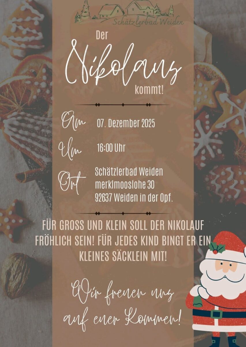 Wartet nicht bis zum Sommer mit Eurem Besuch im Schätzlerbad. In der Weihnachtszeit lädt Wirtsfamilie Wagner zu genussvollen und besinnlichen Momenten ein. Ein besonderes Highlight ist der Nikolausbesuch am 7. Dezember 2025 um 16 Uhr – für jedes Kind gibt es ein kleines Säcklein. Für Familien, Vereine und Firmen sind weiterhin Termine für Weihnachtsfeiern verfügbar. An Heiligabend wird ein Frühstücksbuffet von 9 bis 11 Uhr angeboten, am 1. und 2. Weihnachtsfeiertag ist von 11.30 bis 14 Uhr geöffnet – Gänsebrust bitte vorab reservieren. Kaffee und Kuchen runden den Feiertagsbesuch ab.
