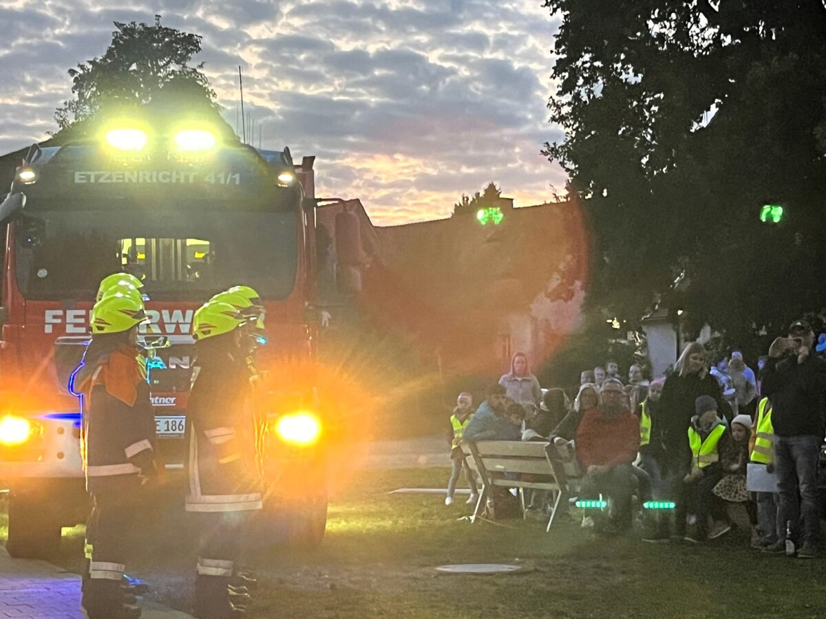 Gestartet wurde der ereignisreiche Abend mit einem ökumenischen Gottesdienst am Dorfplatz mit Pfarrerin Heidi Landgraf und Pfarrer Berthold Heller. Die Ministranten waren von der Jugendgruppe. Die Vereinsfahne war natürlich auch dabei. Der Dorfplatz füllte sich nach und nach, denn alle waren schon gespannt, was ihnen die Feuerwehr zeigen würde. Zur Verpflegung gab es Chili con Carne, Käse, Brezen und für die Kinder spezielle Kinder-Feuerwehrnudeln aus der Feldküche der Patenwehr aus Grafenwöhr.