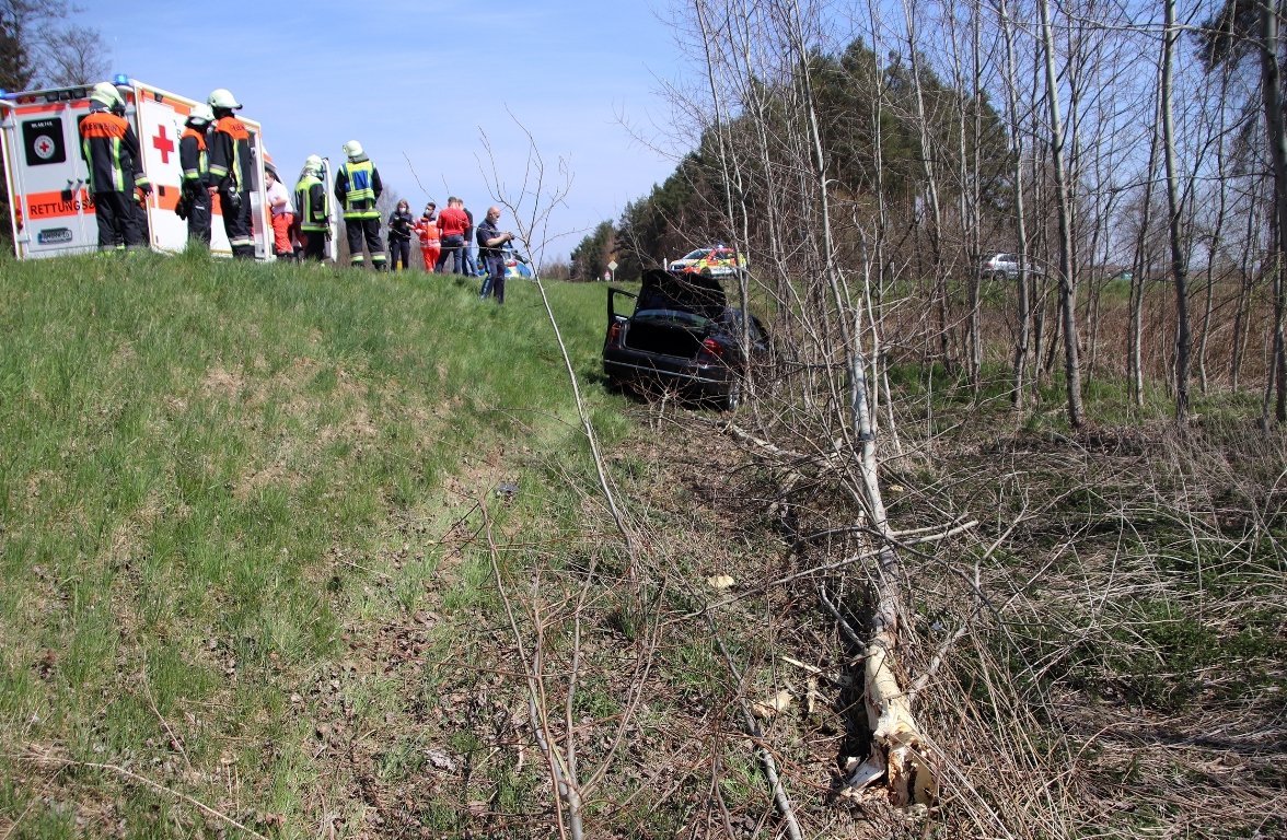 Auf der B299 auf Höhe Kaltenbrunn ist ein Autofahrer (22) von der Straße abgekommen, mit dem Wagen in den drei Meter tiefen Hang hinabgefahren und gegen mehrere Bäume geprallt.