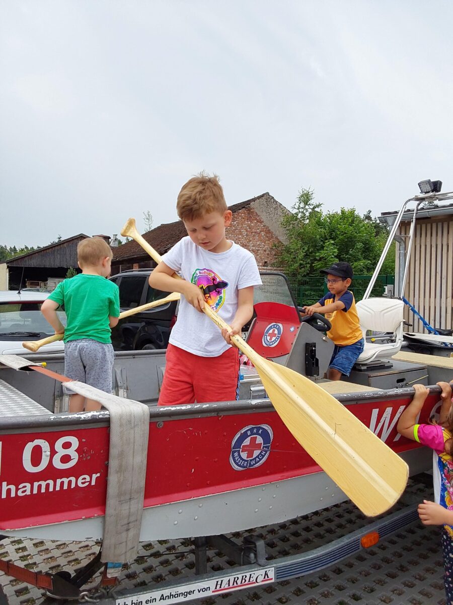 Außerdem überreichte Loti ein Malbuch über das richtige Verhalten an und im Wasser. Gemeinsam wurden dann die Baderegeln erarbeitet und besprochen. Den Höhepunkt bildeten zum Abschluss die praktischen Übungen sowie das Besichtigen des Einsatzfahrzeuges und des Bootes der Wasserwacht-Ortsgruppe und das Erkunden des Materials.