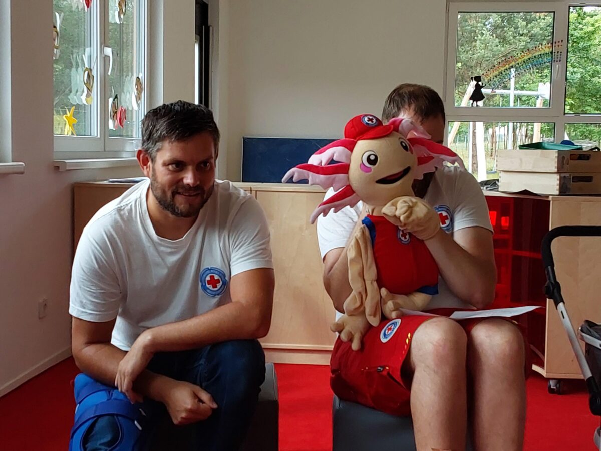 Weiherhammer. Vor kurzem stattete Loti der Kinderkrippe und dem Kindergarten einen Besuch ab. Gemeinsam mit den Assistenten Martin Tafelmeyer und Thomas Heibl von der Wasserwacht-Ortsgruppe erzählte das Axolotl der Wasserwacht Bayern den Kindern wie wichtig es ist, das Schwimmen zu lernen und dass sie es zusammen üben und trainieren können.