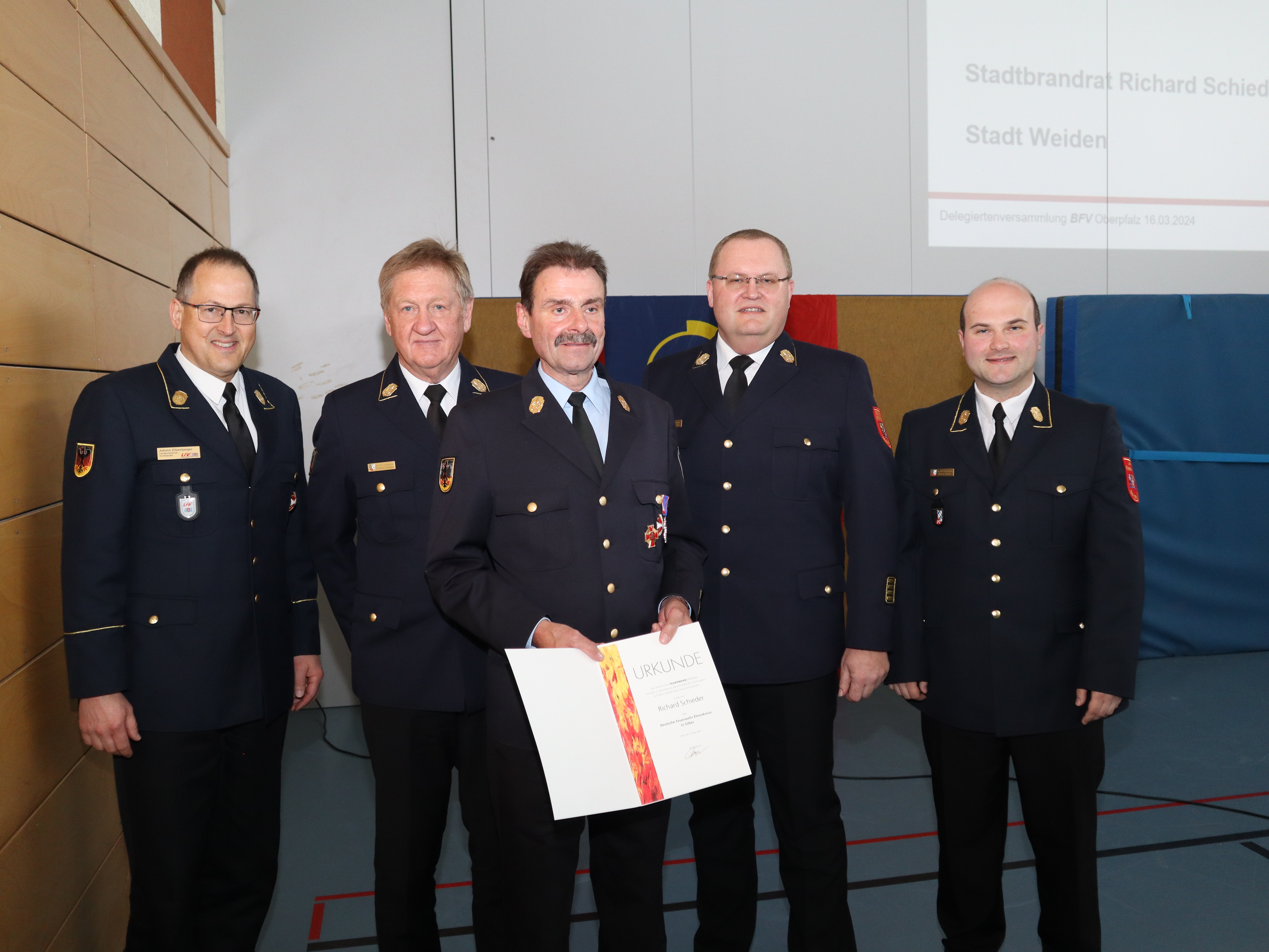 Ein weiterer erfreulicher Punkt folgte mit einer Ehrung. Das Deutsche Feuerwehr-Ehrenkreuz in Silber konnte an Stadtbrandrat Richard Schieder von der Feuerwehr Weiden verliehen werden. Die Ehrung übernahm der Vorsitzende des Landesfeuerwehrverband Bayern, KBR Johann Eitzenberger.