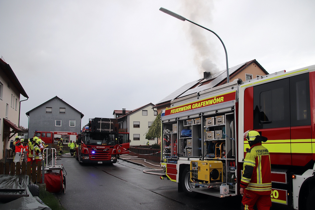 Ein kurzes Gewitter mit starkem Niederschlag zog am Mittwochnachmittag über Grafenwöhr. Ein Blitz schlug in den Dachstuhl eines Zweifamilienhauses in der Pappenberger Straße ein. Rund 100 Einsatzkräfte wurde alarmiert.