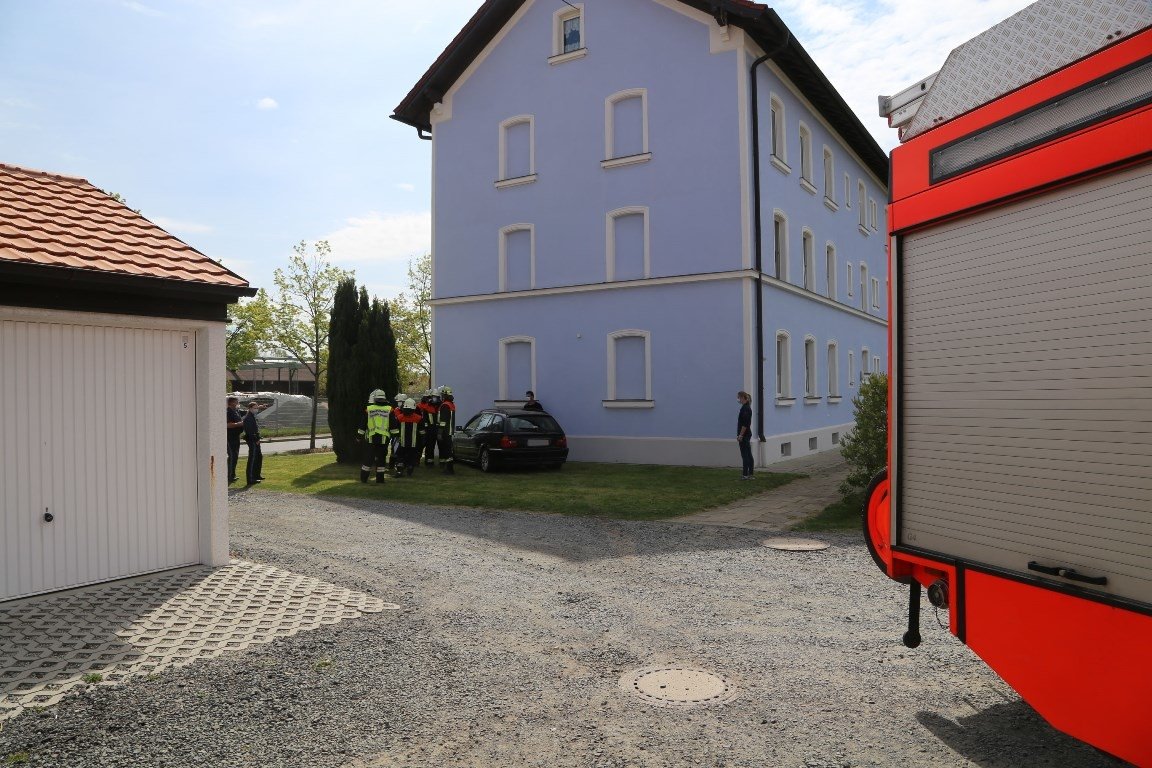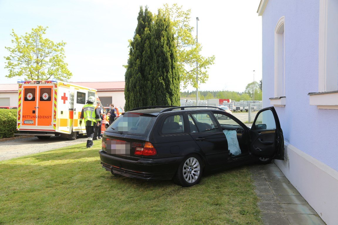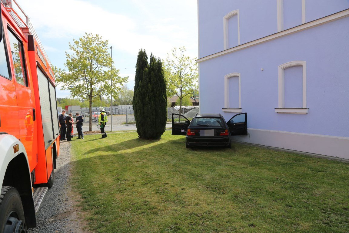 Zu einem spektakulären Unfall kam es heute in Wiesau. Offenbar wollte ein junger Mann (25) mit seinem BMW von einem privaten Parkplatz auf die Tonwerkstraße einbiegen. Wie eine Anwohnerin erzählt gab der Fahrer dann plötzlich Vollgas, die Reifen des älteren Fahrzeugs drehten auf dem geschotterten Parkplatz durch, der Wagen jagte über eine Rasenfläche und prallte schließlich mit voller Wucht gegen ein Mehrfamilienhaus.