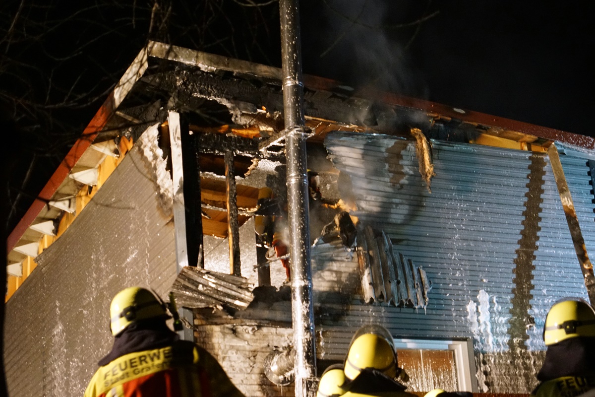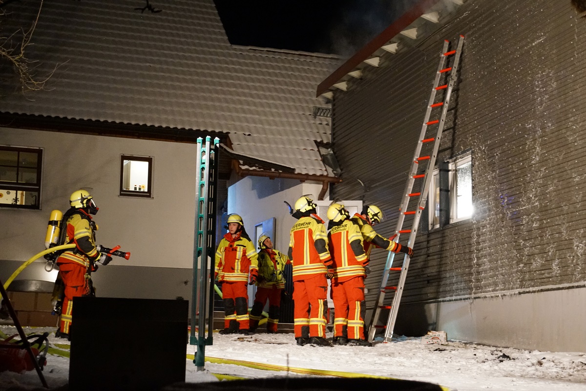 Schon von Weiten war ein heller Feuerschein sichtbar. Beim Eintreffen versuchten zwei Hausbewohner den Brand, der in einem Anbau der Garage ausgebrochen war, zu löschen. Unter schwerem Atemschutz wurde nun von mehreren Seiten versucht, das Feuer zu löschen.