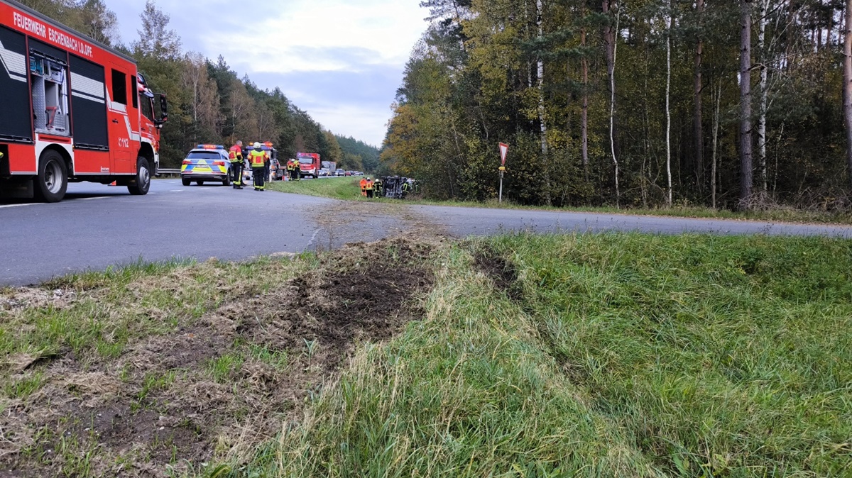 Kurz vor der Einfahrt zum Parkplatz Waldlehrpfad Holzweg kam er aus bisher nicht geklärten Gründen nach rechts von der Fahrbahn ab und durchfuhr das Bankett. Danach nahm der Wagen die Einfahrt als Sprungschanze und flog etwa 25 Meter durch die Luft, ehe er wieder mit der Wagenfront auf dem weichen Untergrund aufschlug. Darauf kippte der Ford um und blieb auf der Beifahrerseite liegen – laut Polizei etwa 50 Meter vor der “Abflugstelle”.