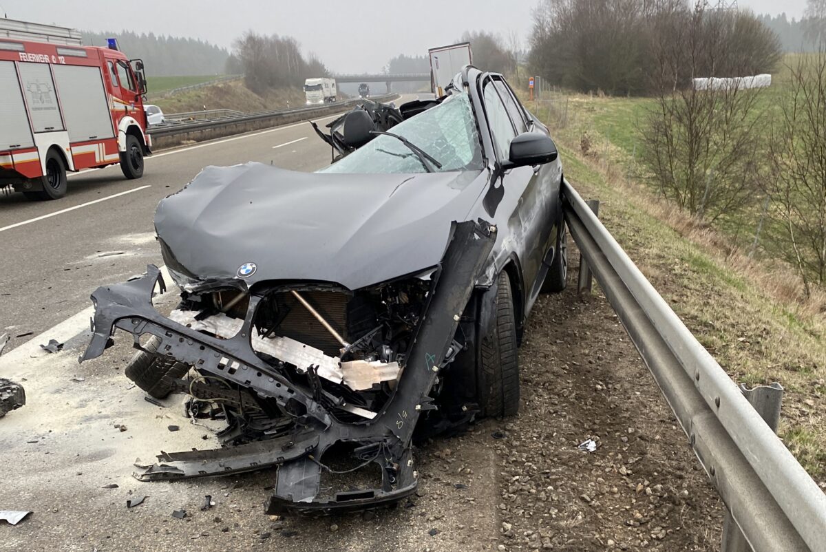 Hierbei geriet ein Mann (62) mit einem BMW X3 vermutlich aufgrund überhöhter Geschwindigkeit beim Überholen eines Sattelzuges ins Schleudern. Er prallte zunächst seitlich in den Sattelzug und schleuderte dann in die Außenschutzplanke. Der Wagen wurde hierbei total zerstört und kam auf der Fahrbahn zum Stehen.