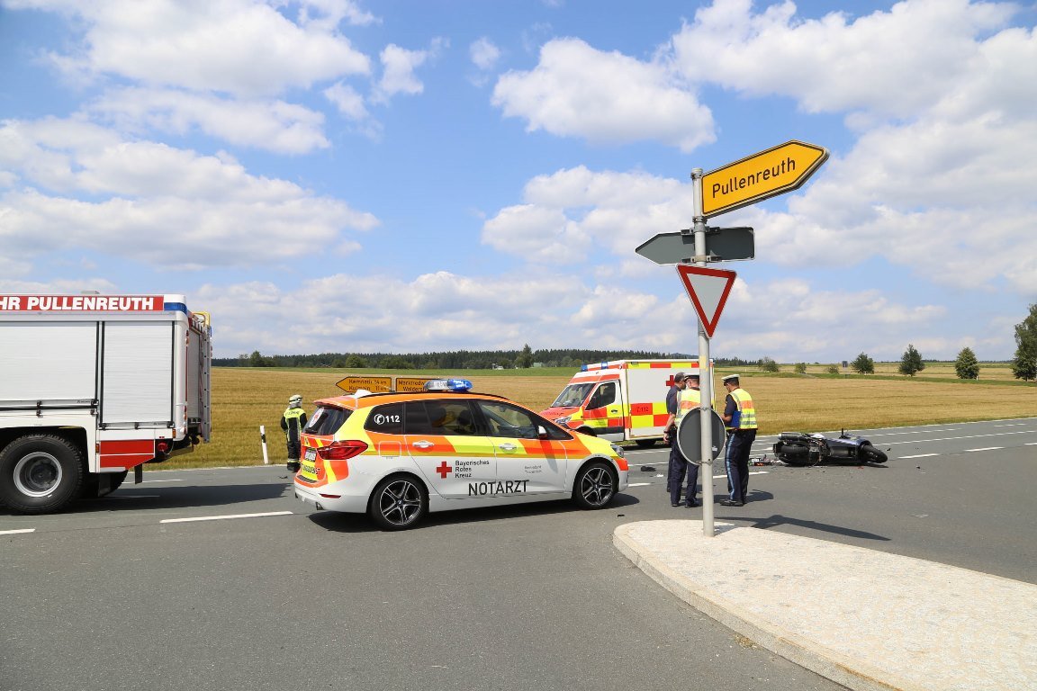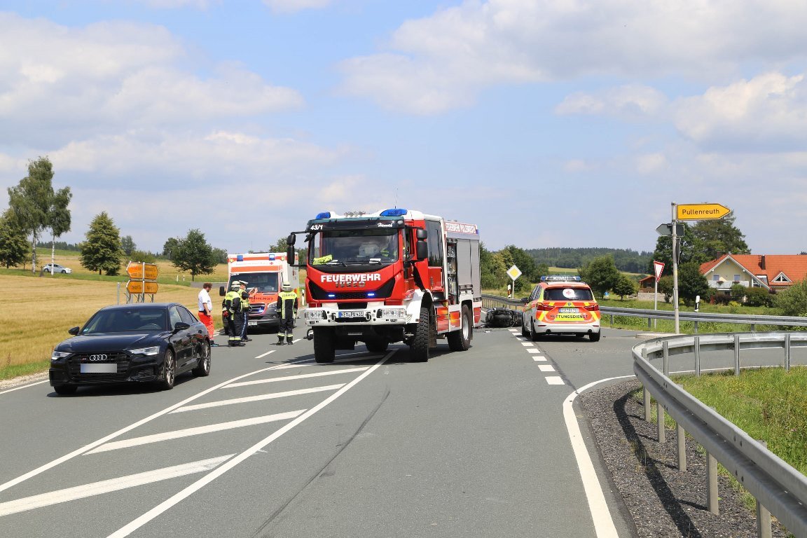 Nach ersten Informationen des Polizeipräsidiums Oberpfalz ist es in der Mengersreuther Straße in Pullenreuth zu einem schweren Verkehrsunfall gekommen: Ein Motorradfahrer soll laut Polizeiangaben bei dem Unfall gegen 13.45 Uhr getötet worden sein.