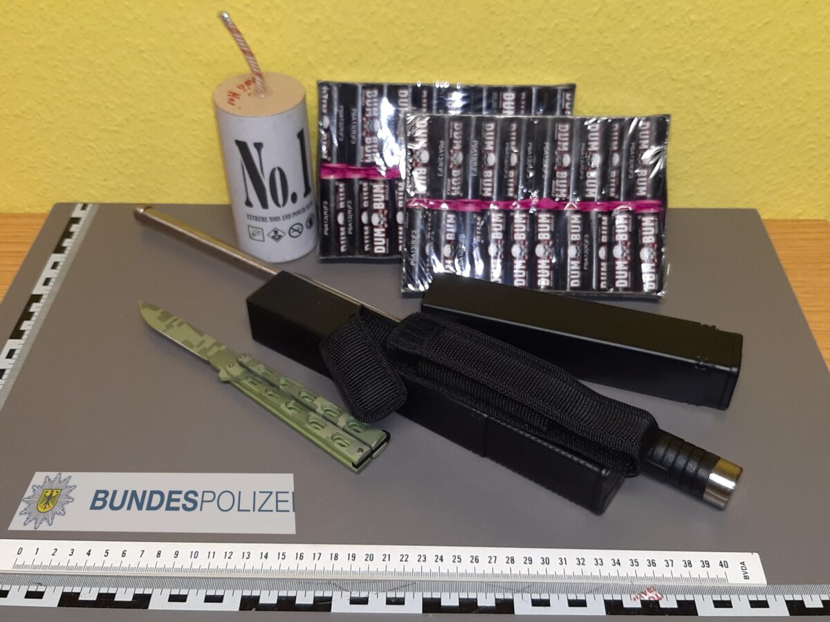 Als würde eine Strafanzeige nicht reichen, hatten sich einige Reisende neben der Pyrotechnik auch noch mit Waffen eingedeckt. Die Bundespolizisten entdeckten zwei Schlagringe, einen Elektroschocker, ein Butterflymesser und zwei Teleskopschlagstöcke. Die Waffenschmuggler handelten sich damit noch eine Anzeige wegen Verstößen gegen das Waffengesetz ein.