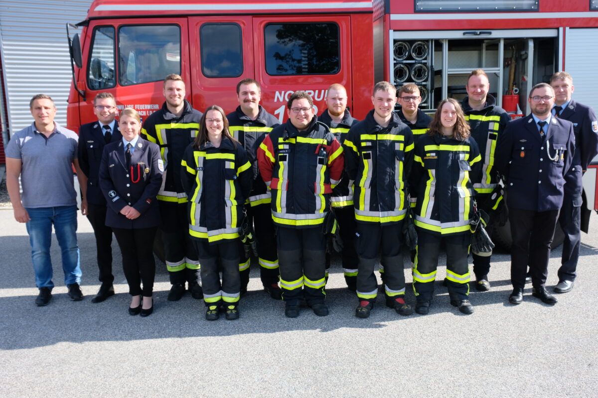 Neun Aktive, darunter auch zwei junge Damen, strahlten am Wochenende auf dem Vorplatz des Feuerwehrgerätehauses um die Wette, als Kreisbrandinspektor Wolfgang Schwarz, Kreisbrandmeister Jürgen Haider und Kreisbrandmeisterin Mirjam Schuller nach Beantwortung eines Fragenkatalogs, der Maschinisten-Kunde, einer Trockensaugprobe und dem gewohnten „Wasser marsch“ offiziell verkündeten: „Leistungsprüfung bestanden“.