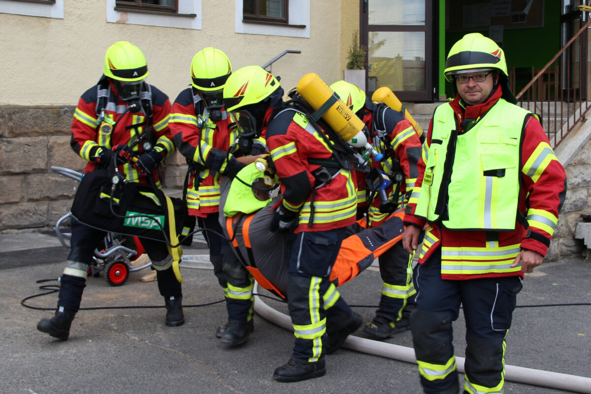 Schnell kommt die Feuerwehr Kirchenthumbach mit zwei Löschgruppenfahrzeugen und einem Mehrzweckfahrzeug. Einsatzleiter Fabian Leipold schickte einen Trupp unter schwerem Atemschutz ins Gebäude, um die vermisste Person zu retten. Der Trupp konnte den Mann finden und ins Freie tragen.