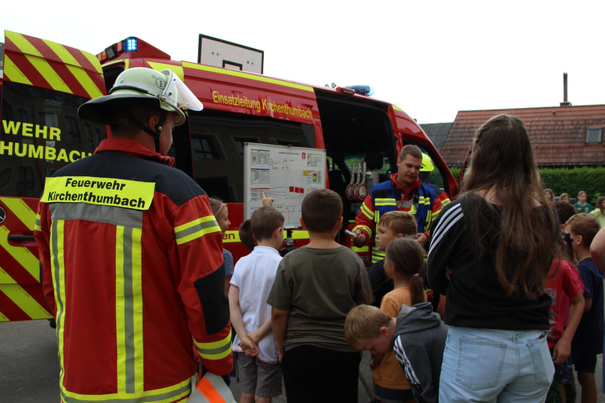 Die Kinder durften ihren Sammelplatz verlassen und bei der Übung zusehen. Anschließend konnten sie den modernen Fuhrpark der Feuerwehr besichtigen und den Einsatzkräften Löcher in den Bauch fragen. Feuerwehr, Bürgermeister und Schule zeigten sich am Ende sehr zufrieden und konnten die Übung mit einem erfolgreichen Ergebnis abschließen.