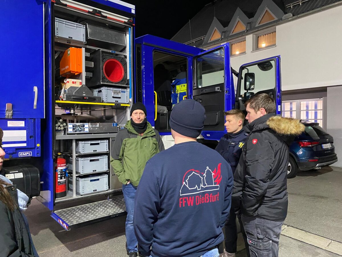 An die theoretische Einführung schloss sich eine Besichtigung des Fuhrparks des THW an. Dabei standen die modernen und umfangreich ausgestatteten Einsatzfahrzeuge im Mittelpunkt. Die Mitglieder der Feuerwehr Dießfurt zeigten sich beeindruckt von der technischen Ausstattung und Ausrüstung der Fahrzeuge. Es bot sich die Gelegenheit, spezifische Fragen zu stellen und Erfahrungen mit den THW-Mitgliedern auszutauschen.