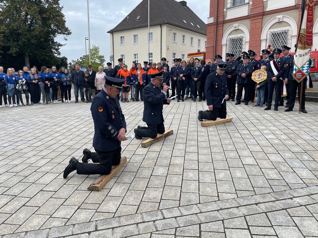 „Ich weiß, ihr wollt uns heute fragen, was euch auf dem Herzen liegt, dass ihr uns wieder als Paten kriegt. Doch bevor wir euch erhören, müsst ihr euch bewähren und nach alter Vätersitte, vortragen eure Patenbitte“, begrüßt Zischka allen voran die Altenstädter Wehr. Neustadts 2. Vorstand Maximilian Schwarz fordert anschließend die Altenstädter Vorstandschaft Wolfgang Müller und Gottfried Amschl und den 2. Kommandanten Markus Lindner zum eigentlichen Teil des Brauches auf. „So kniet euch hin, seid nicht eitel, auf dieses harte, hölzerne Scheitel“. Nach dem „Scheitelknien“ sagte Zischka der Patenschaft zu.