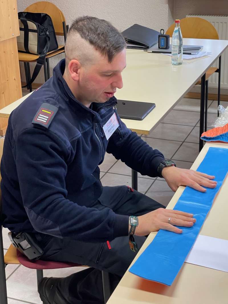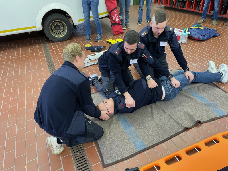 Nach einer kurzen Pause ging es um die Versorgung von Wunden und Blutungen, Amputationsverletzungen, das Anlegen einer Abbindung mittels eines sogenannten Tourniquets sowie um die Ruhigstellung von Knochenbrüchen. Außerdem hatten die Teilnehmer die Gelegenheit, die stabile Seitenlage zu üben und die mechanische Reanimationshilfe des Rettungsdienstes, LUCAS 2, kennenzulernen.
