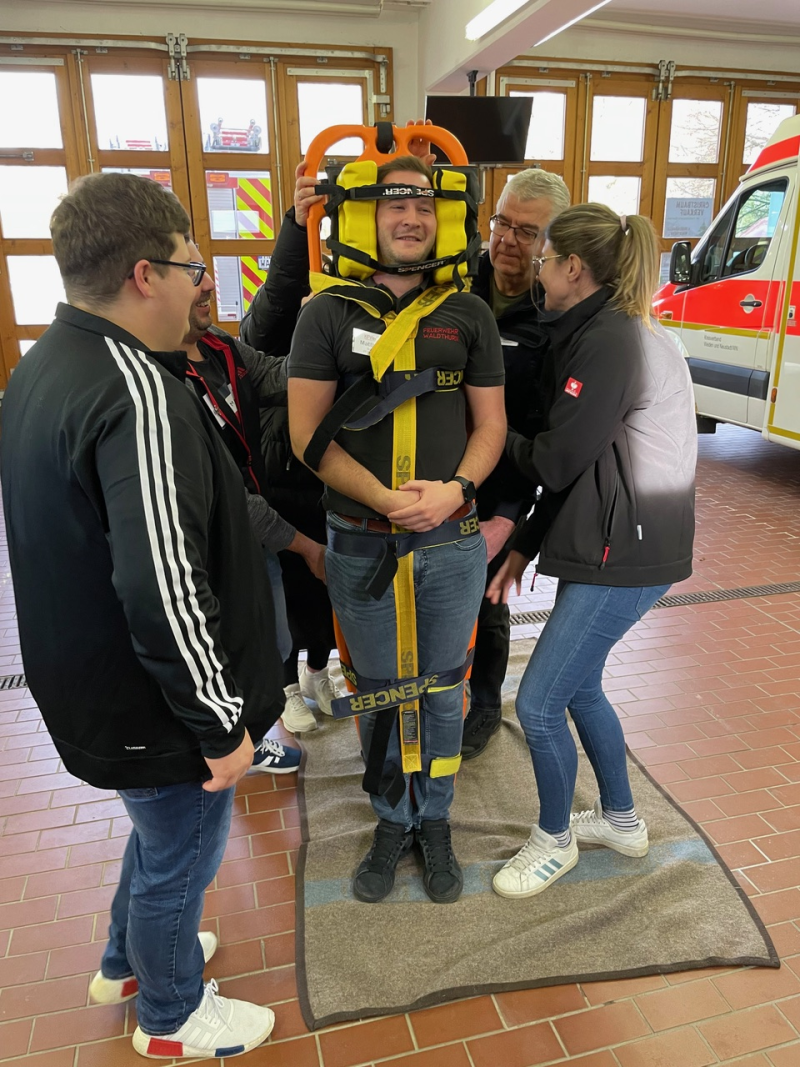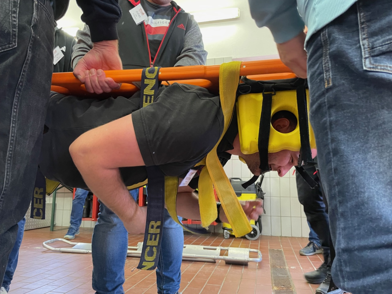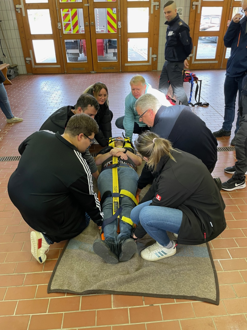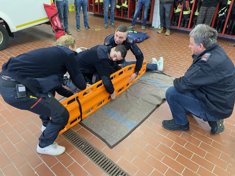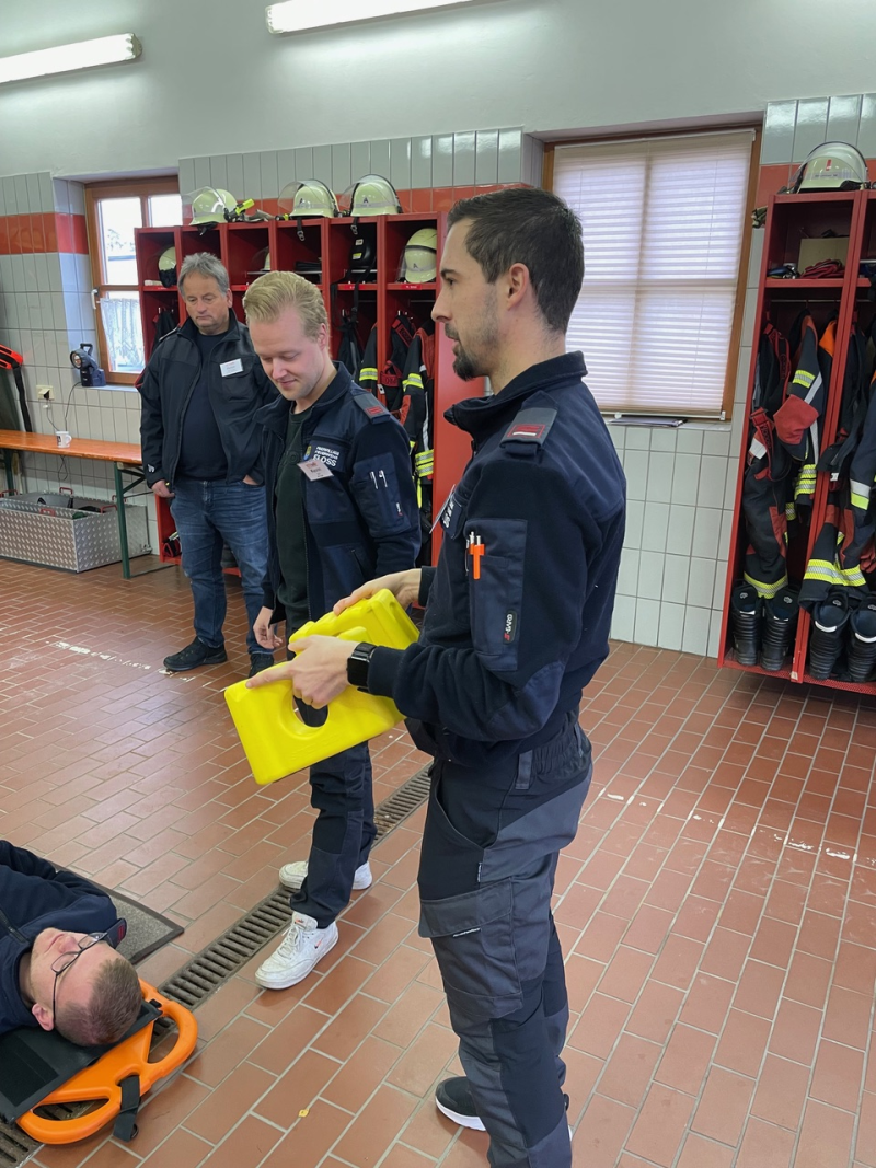 Im zweiten Teil des Lehrgangs am Samstag stand dann die Praxis im Vordergrund. Nach einer kurzen Vorstellung der Ausbilder wurden die Teilnehmer in Kleingruppen aufgeteilt. Die Teilnehmerinnen und Teilnehmer übten, wie ein Helm abgenommen oder eine Halskrause (Stiff neck) angelegt wird. Sie übten die Rettung aus Fahrzeugen ohne Hilfsmittel und mit dem sogenannten KED-System sowie den Patiententransport mit Tragetuch, Schaufeltrage, Vakuummatratze oder Spineboard.