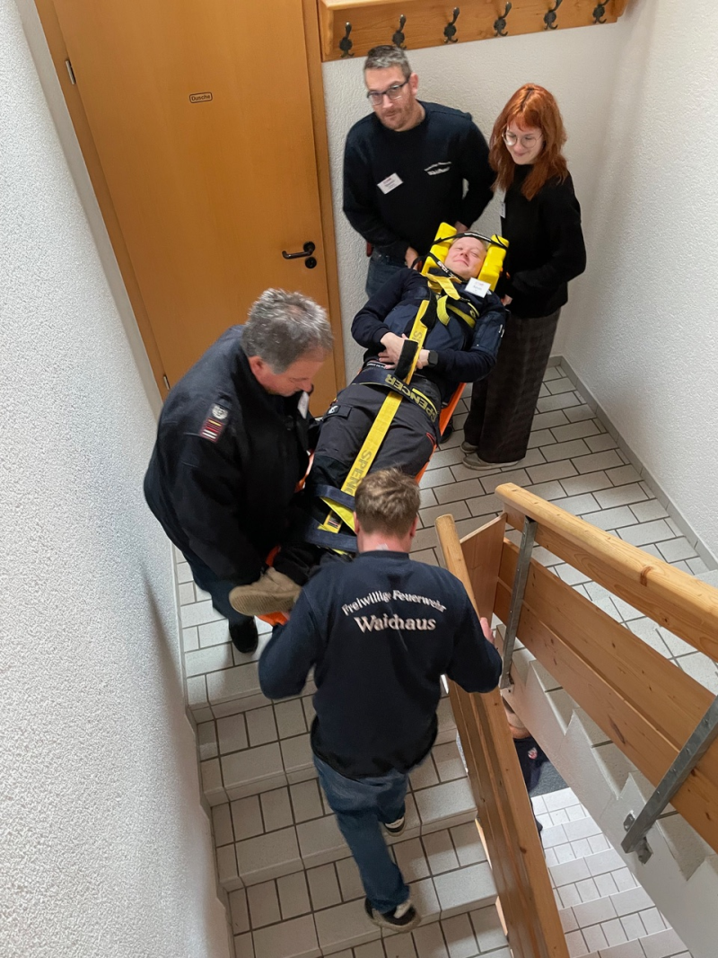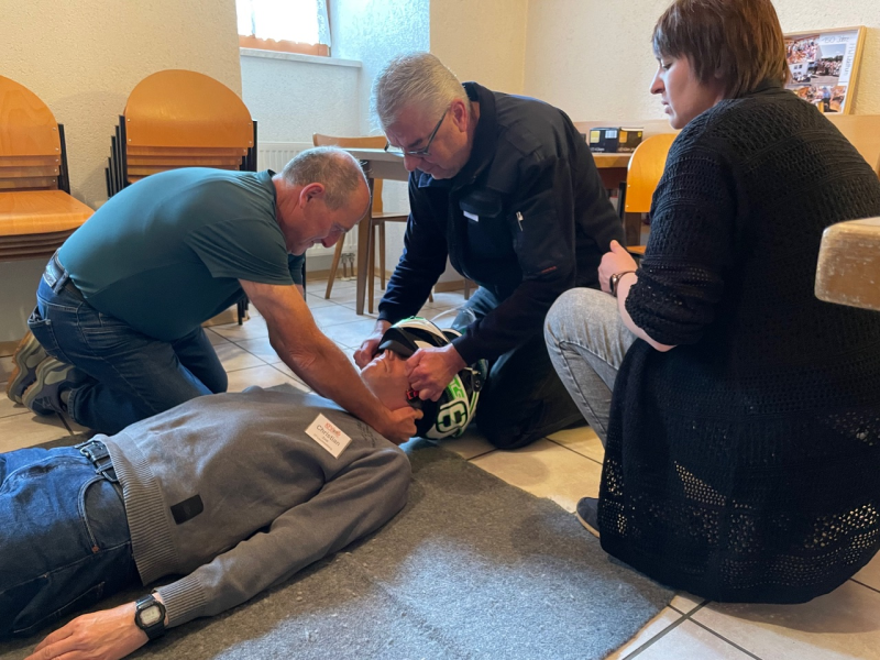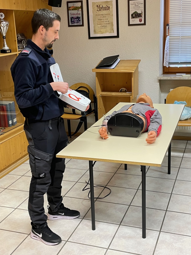 An einer weiteren Station wurde der Umgang mit dem automatischen externen Defibrillator (AED) geschult. Ausbildungsziel war es hier, den Anwendern die Angst vor der Benutzung des AED zu nehmen und dessen einfache Anwendung aufzuzeigen. Dann ging es für die Teilnehmerinnen und Teilnehmer ans Eingemachte. In zwei Gruppen galt es, realistisch inszenierte Notfallszenarien realitätsnah abzuarbeiten. Wichtiges Ziel der Ausbildung war es hier, den Teilnehmern zu vermitteln, dass es einen Teamleiter geben muss. So gelang es den Feuerwehrkameradinnen und -kameraden, eine Reanimation fünfzehn Minuten lang fortzusetzen, bis der Notarzt und Rettungsdienst eintrafen.