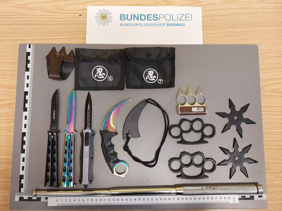 Bei seiner Kontrolle in Waldsassen entdeckten die Beamten ein kleines Arsenal, das er sich in Tschechien zugelegt hatte. In verschiedenen Verstecken und zum Teil offen im Fahrzeug lagen zwei Butterflymesser, ein Springmesser, ein gekrümmtes Karambitmesser, zwei Wurfsterne, ein Teleskopschlagstock und drei Schlagringe. Einer davon ist eine Art verbotenes Multitool. Der Gegenstand kombiniert ein Feuerzeug mit einem Schlagring, der in drei scharfen Klingen endet. Ob das für Gerät für eine Raucherpause während einer Schlägerei diene, vermochte der Käufer nicht zu sagen.