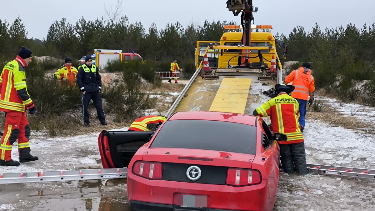 Vor Ort konnte jedoch schnell Entwarnung gegeben werden. Es wurde zwar ein Wagen im Wasser entdeckt, der “badete” jedoch nicht im Freizeitsee, sondern stand auf einem benachbarten Parkplatz. Der Ford Mustang hatte sich in einem 30 Zentimeter tiefen, zugefrorenen Wassersee festgefahren. Der 28-jährige Fahrer und sein 20-jähriger Beifahrer konnten sich nicht mehr selbst befreien. Nachdem eine Leiter angelegt wurde, verließen sie unverletzt den Wagen. Der war nicht mehr fahrbereit und musste durch ein Abschleppfahrzeug rausgezogen werden.