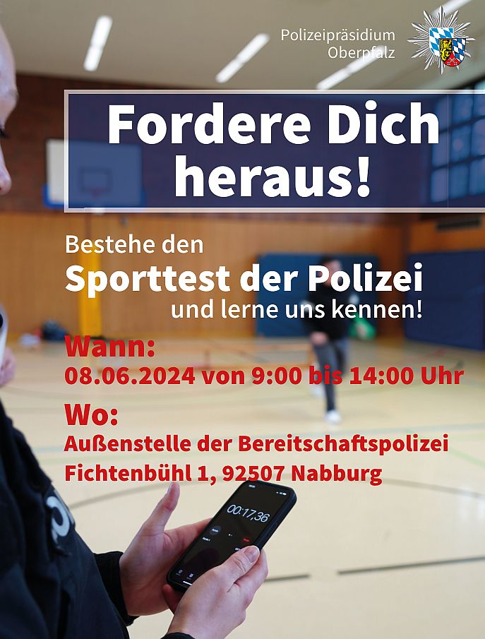 Unter dem Motto „Fordere Dich heraus!“ dürfen alle Interessierten probehalber den Sporttest der Bayerischen Polizei ausprobieren und sehen sofort, ob sie fit genug sind, die Einstellungsprüfung zu bestehen. Zudem bietet das Präsidium ein exklusives Programm, um den Polizeiberuf näher kennenzulernen. Auch die Eltern sind herzlich eingeladen, ihre Kinder zu begleiten.