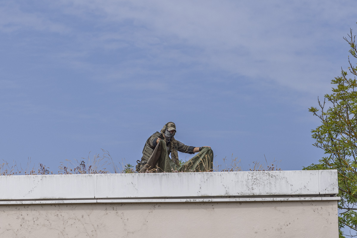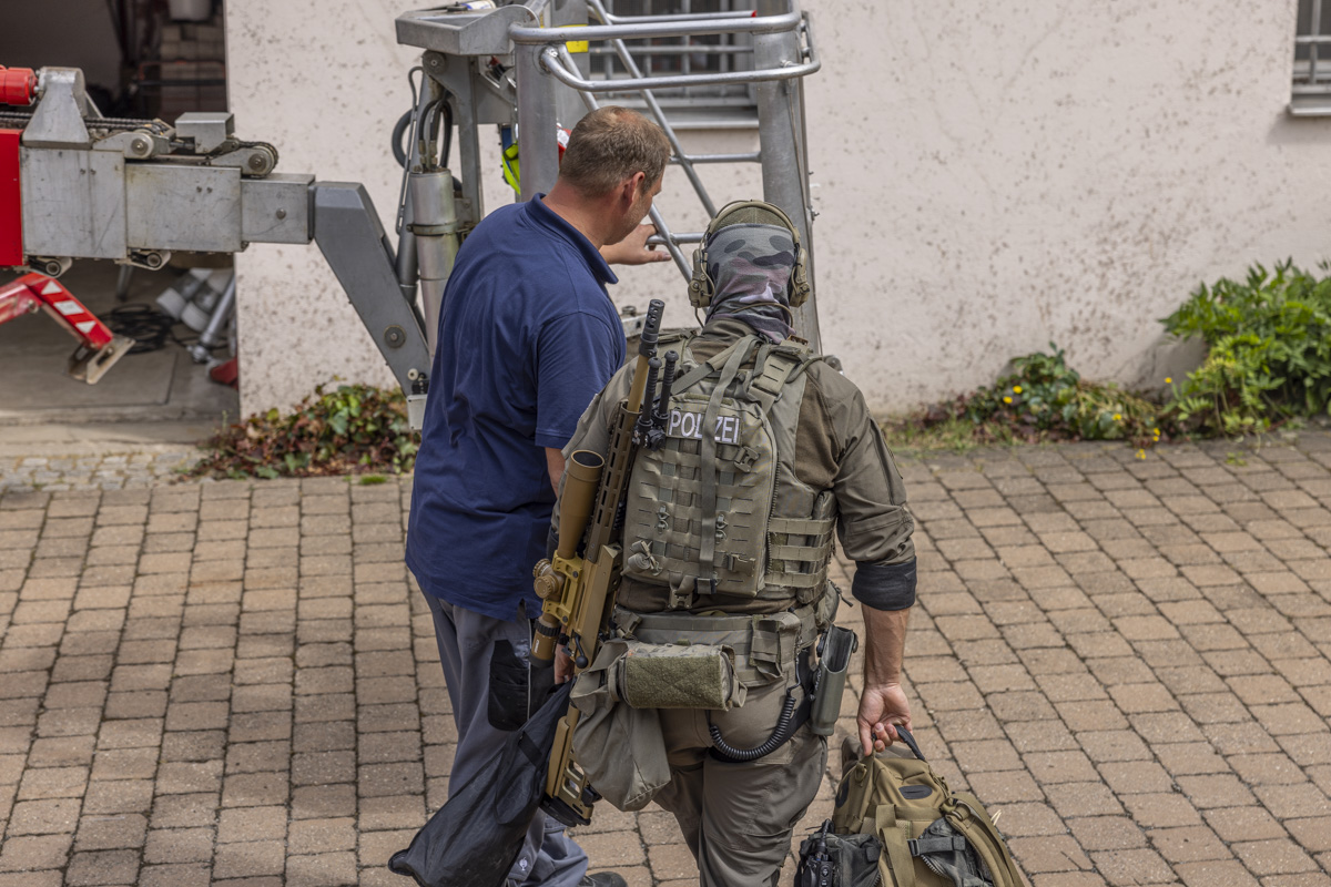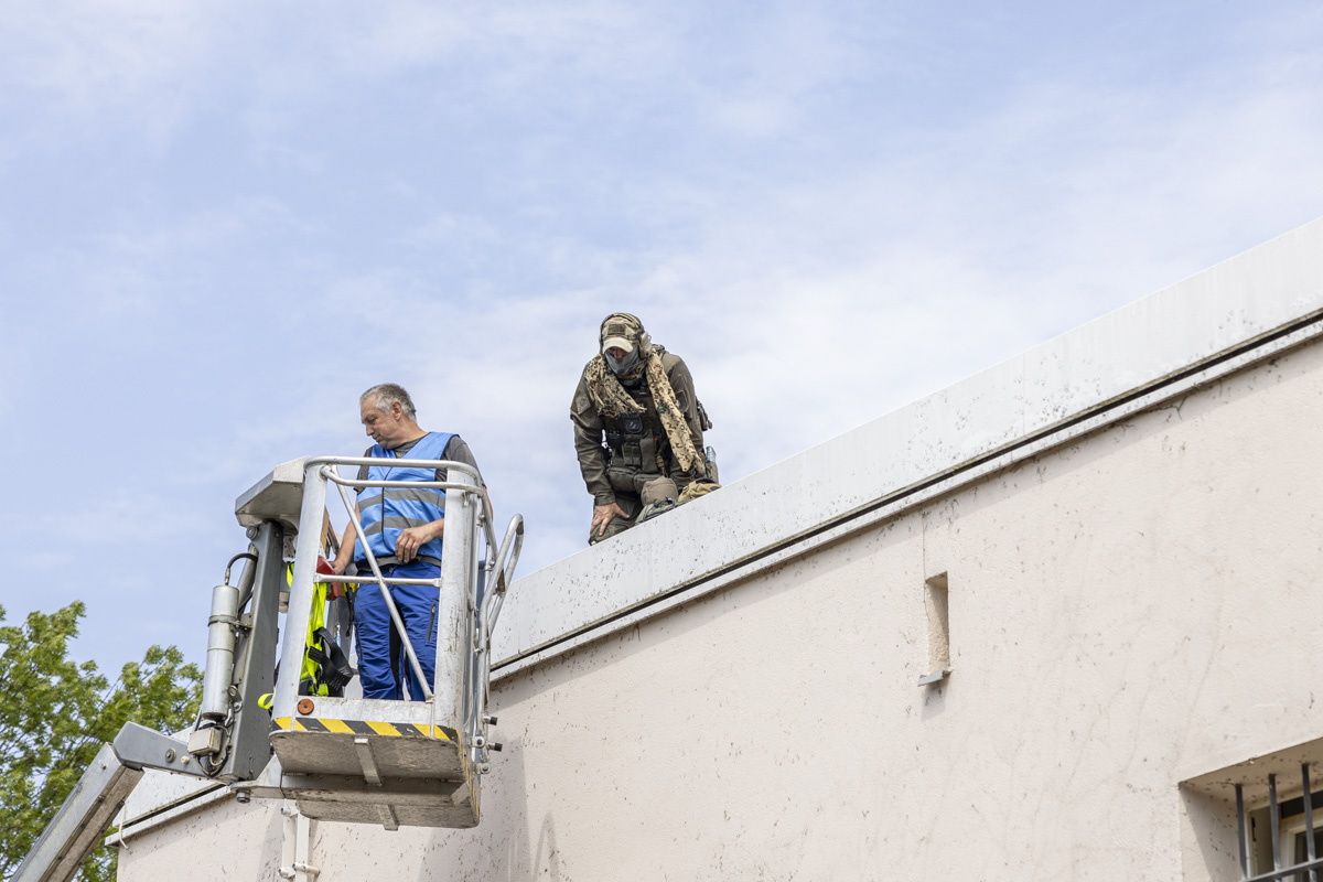 Rädchen greift in Rädchen. Harald Bäumler, Abteilungsleiter der JVA Weiden, druckt Lagepläne seines Gefängnisses für die Spezialkräfte aus. Vor der Gefängnismauer loten sie Zugriffsmöglichkeiten aus. Man will sich gar nicht ausmalen, wie sich die SEKler fühlen. In ihren 30 Kilo schweren Monturen bei 30 Grad in schwüler Hitze. Mit einer Hebebühne manövriert ein JVA-Mitarbeiter einen Scharfschützen aufs Dach. Er bezieht Stellung.