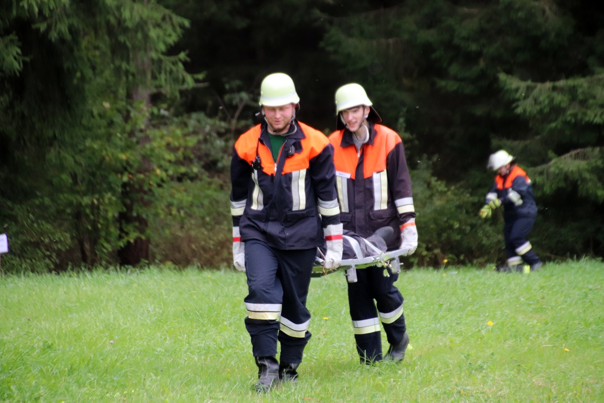 Die besondere Herausforderung an diesem Nachmittag: Der fiktive Brandherd lag tief im Wald und war nur über einen einzigen, schmalen Zugangsweg erreichbar. Schon die ersten Kräfte mussten ihre Schläuche rund 500 Meter tragen, ehe überhaupt ein Löschaufbau möglich war. Neben einem Bodenfeuer, das sich im Unterholz ausbreitete, sah das Szenario auch neun verletzte Personen vor, die sich in unmittelbarer Nähe des Feuers aufhielten.