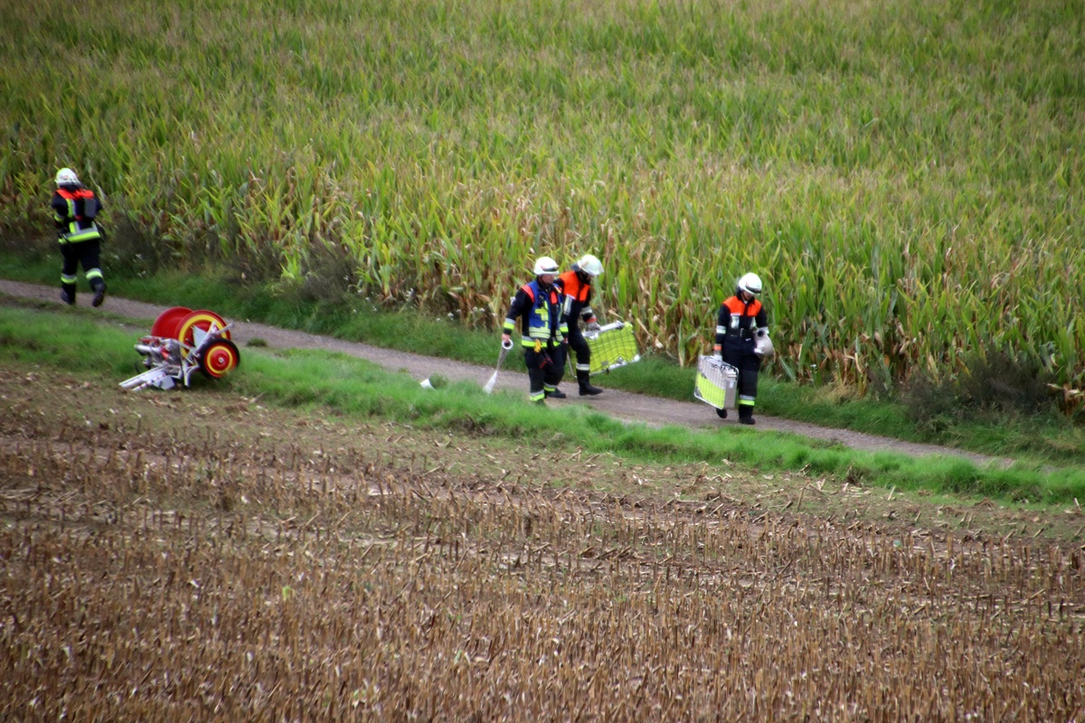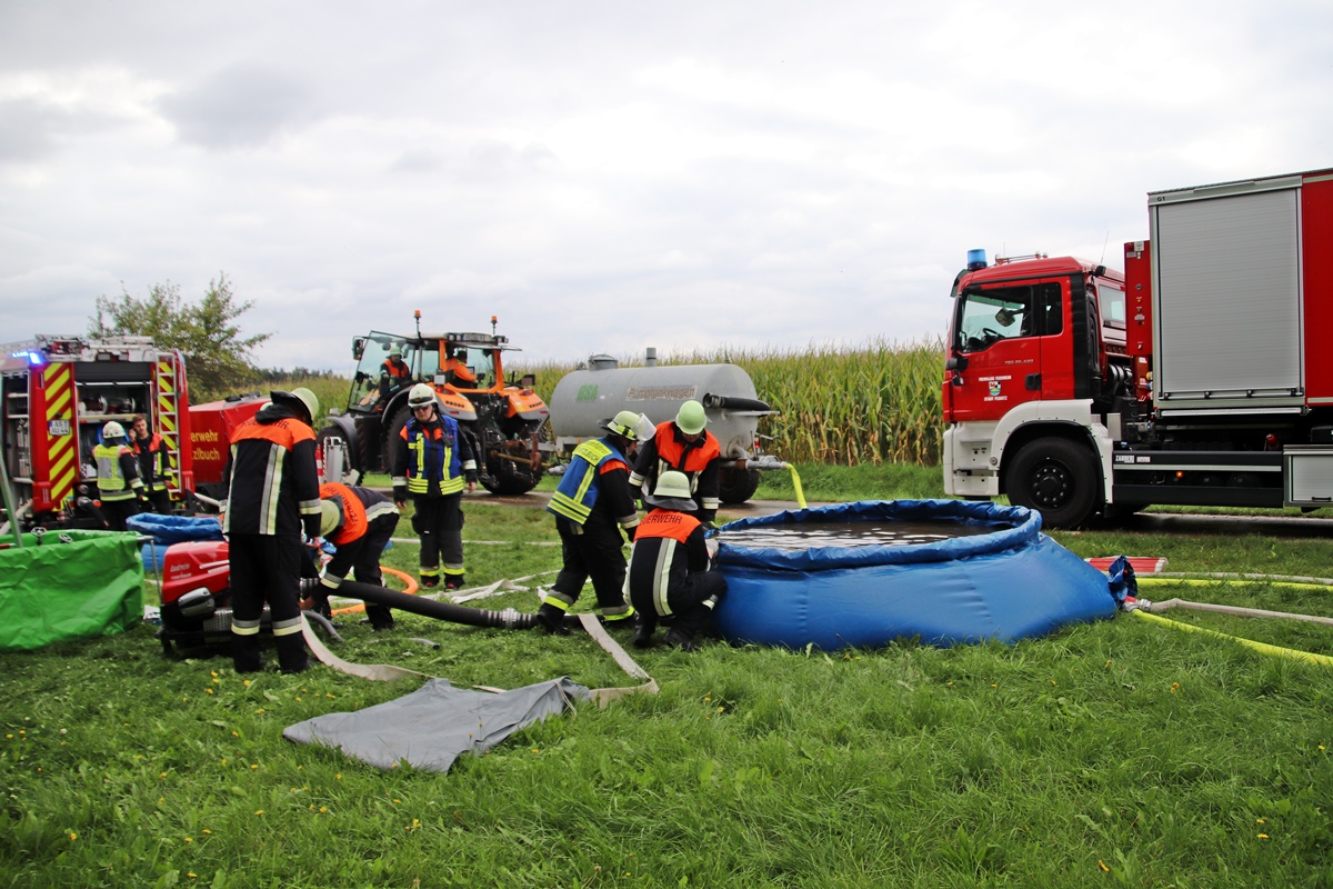 Die Situation verschärfte sich zusätzlich, als Funkenflug das angrenzende Feld in Brand setzte. Damit mussten die Einsatzkräfte ihre Taktik anpassen und eine kilometerlange Schlauchleitung legen, um ausreichend Wasser heranzuführen. Parallel dazu organisierten die Wehren aus Michelfeld, Neuhaus und Pegnitz einen Pendelverkehr: Löschfahrzeuge befüllten am Hydranten im Industriegebiet Saaß ihre Tanks und brachten das Wasser zum Bereitstellungsraum, wo es in großen Faltbehältern gesammelt wurde. Von dort aus erfolgte die Versorgung der Einsatzabschnitte.