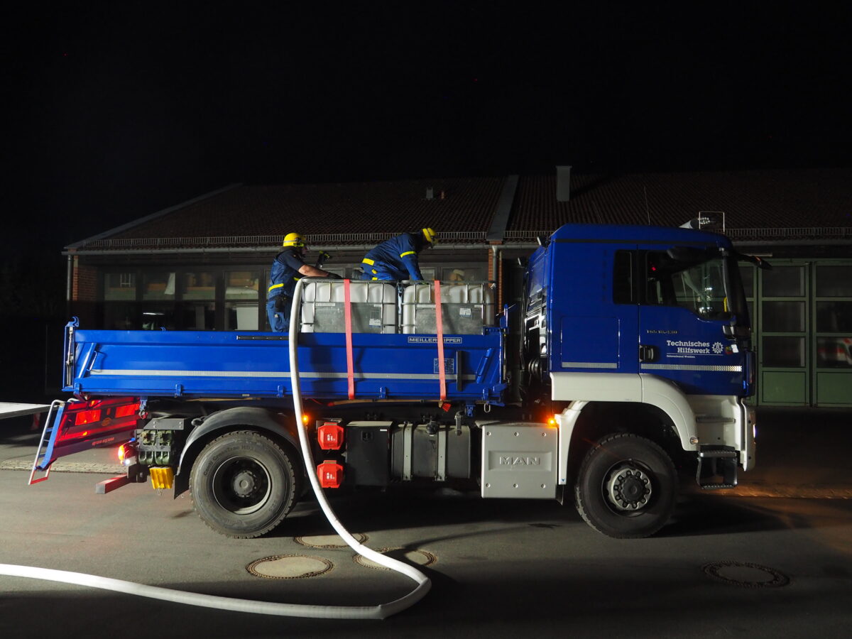 Direkt im Anschluss an die „Aufwärmübung“ ein klassischer Auftrag für die Katastrophenschützer: Die Stadt Weiden hat bei der Clausnitzerschule für die Bevölkerung eine Ausgabestelle für Brauchwasser eingerichtet, schließlich geht auch keine Klospülung mehr, weil die Pumpen für die Wasserversorgung stillstehen. Das Wasser musste mittels Tauchpumpen aus der Zisterne im Bauhof in mehrere Tausend Liter fassende IBC-Behälter umgepumpt werden.