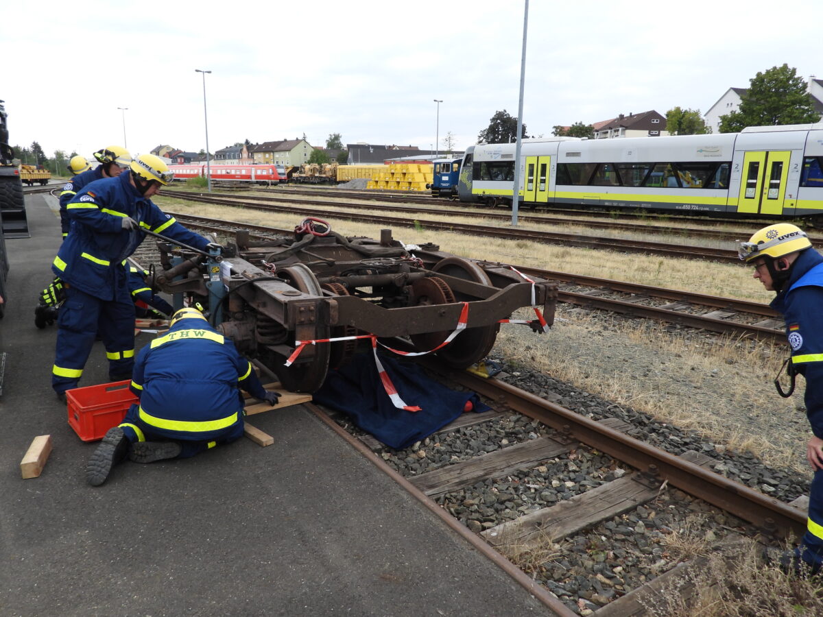 Alle anderen 23 Übungsteilnehmer wurden bei jeder Alarmierung überrascht, sodass beim simulierten Zugunglück an alles gedacht werden musste. Dazu zählten zum Beispiel die Gleissperrung, die Notentriegelung der Notausgänge sowie die schonende Rettung der panisch schreienden fünf Darsteller des Bayerischen Roten Kreuzes (BRK) Weiden mittels einer Rettungsplattform und verschiedenen Krankentragen. Dabei wurden die Teilnehmer auf Basis verschiedener Einspielungen wie panisch schreienden Angehörigen oder einem aufdringlichen Fotografen der Boulevard-Presse zusätzlich unter Stress gesetzt.