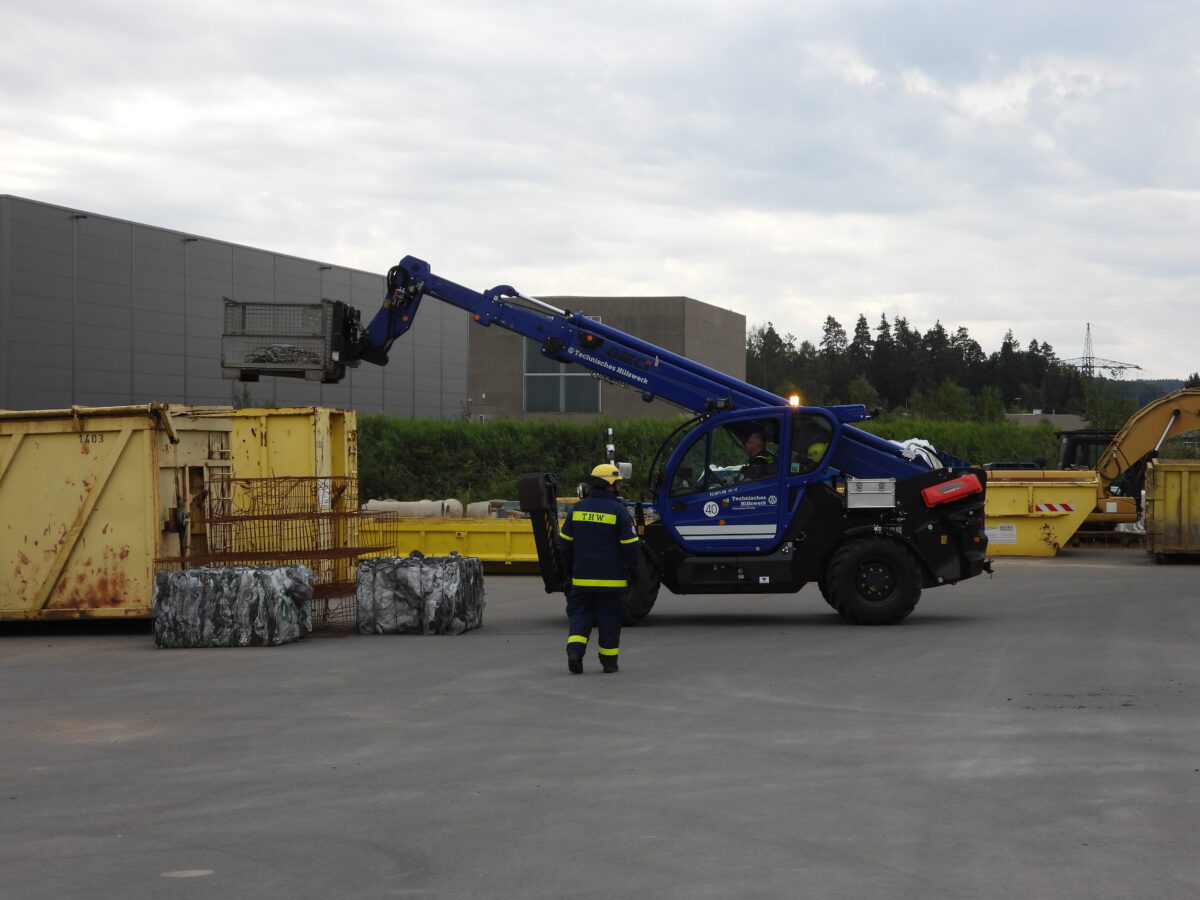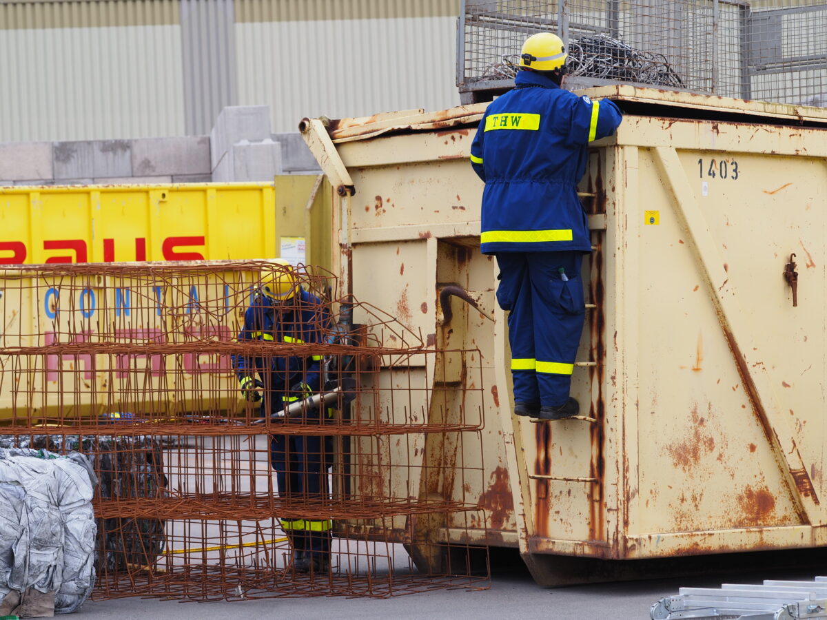 Als letzte Übungseinheit des Tages führte die Alarmierung auf das Werksgelände der Firma Container Kraus am Brandweiher in Weiden, wo ein Mitarbeiter in einem Schrottcontainer mit Deckel eingeschlossen und unter Trümmern verschüttet war. Mit dem Teleskoplader musste zunächst verschiedene Hindernisse beseitigt werden, bevor die Bergungsgruppe dann mit der hydraulischen Rettungsschere ein Stahlgittergeflecht beseitigen konnte, um an die Kurbel für den Deckel des Schrottcontainers zu kommen.