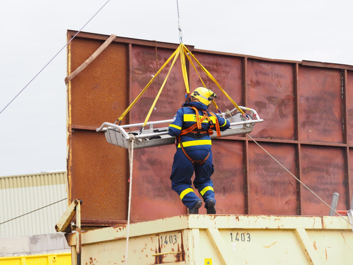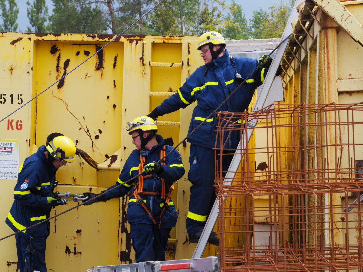 Der Deckel wurde dabei aus Sicherheitsgründen vorher mit der Seilwinde des Gerätekraftwagens gesichert und dann vorsichtig geöffnet. Schließlich wurde die Übungspuppe aus dem Container mittels dem Gerätesatz „Absturzsicherung“ von oben aus dem Container in einer Krankentrage gehoben und an den Rettungsdienst übergeben. Nachdem die eingesetzten Gruppenführer die Aufgabe als erledigt an den einsatzleitenden Zugtrupp gemeldet haben, war die Übungsserie beendet.