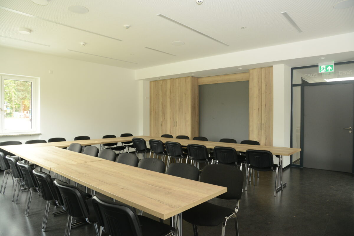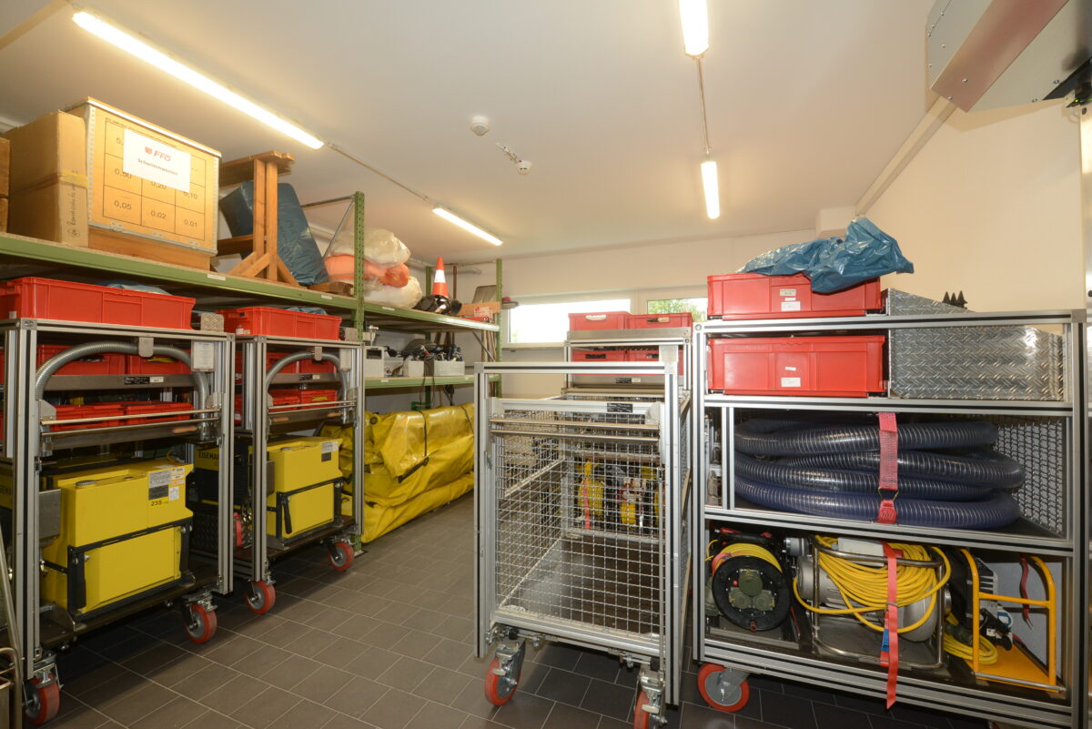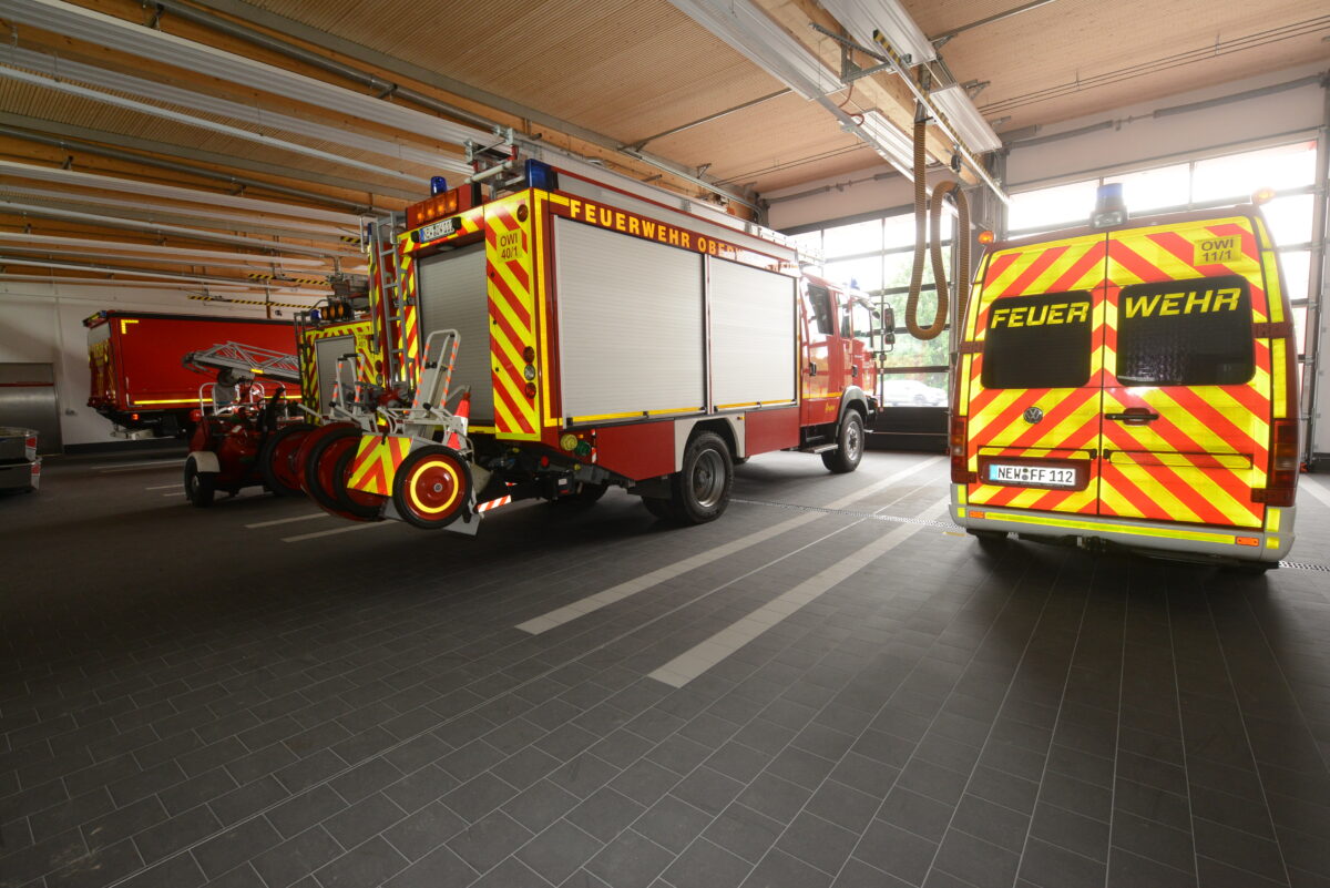 Die Alarmausfahrt erfolgt über die vorbeiführende Kreisstraße NEW 21 und ermöglicht somit ein großzügiges und schnelles Ausrücken. Bei einer Alarmierung der Einsatzkräfte werden die beiden Zugangstüren zu den Umkleideräumen automatisch entriegelt, das Licht schaltet sich automatisch ein. Energieeinsparen wird aber auch im Feuerwehrhaus großgeschrieben: Die Deckenbeleuchtung der Fluren wird nur mit Bewegungsmelder eingeschaltet.