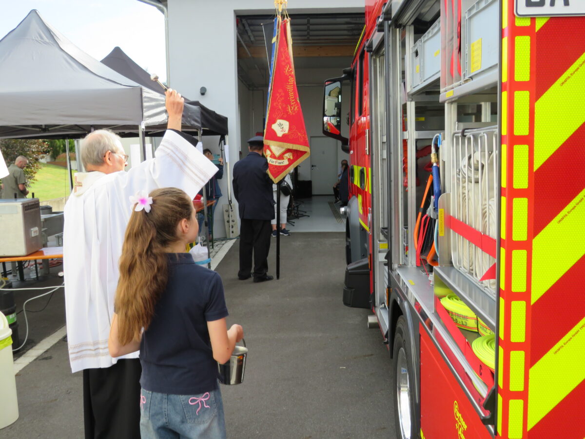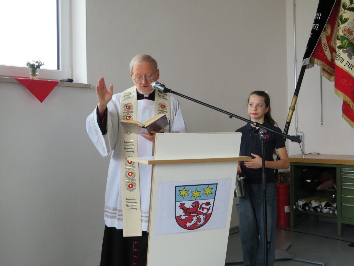 Der 2. Vorsitzender des Feuerwehrvereins Wolfgang Käs begrüßte die Gäste, Ehrengäste und Abordnungen der Nachbarfeuerwehren. Nach der Begrüßung segnete Pfarrer Dr. Josef Ammer die Räume des neu gebaute Gerätehaus. In seiner kurzen Ansprache hob er die ehrenamtliche Leistung der Feuerwehren hervor. Danach segnet er auch das neue Tragkraftspritzenfahrzeug mit Weihwasser.