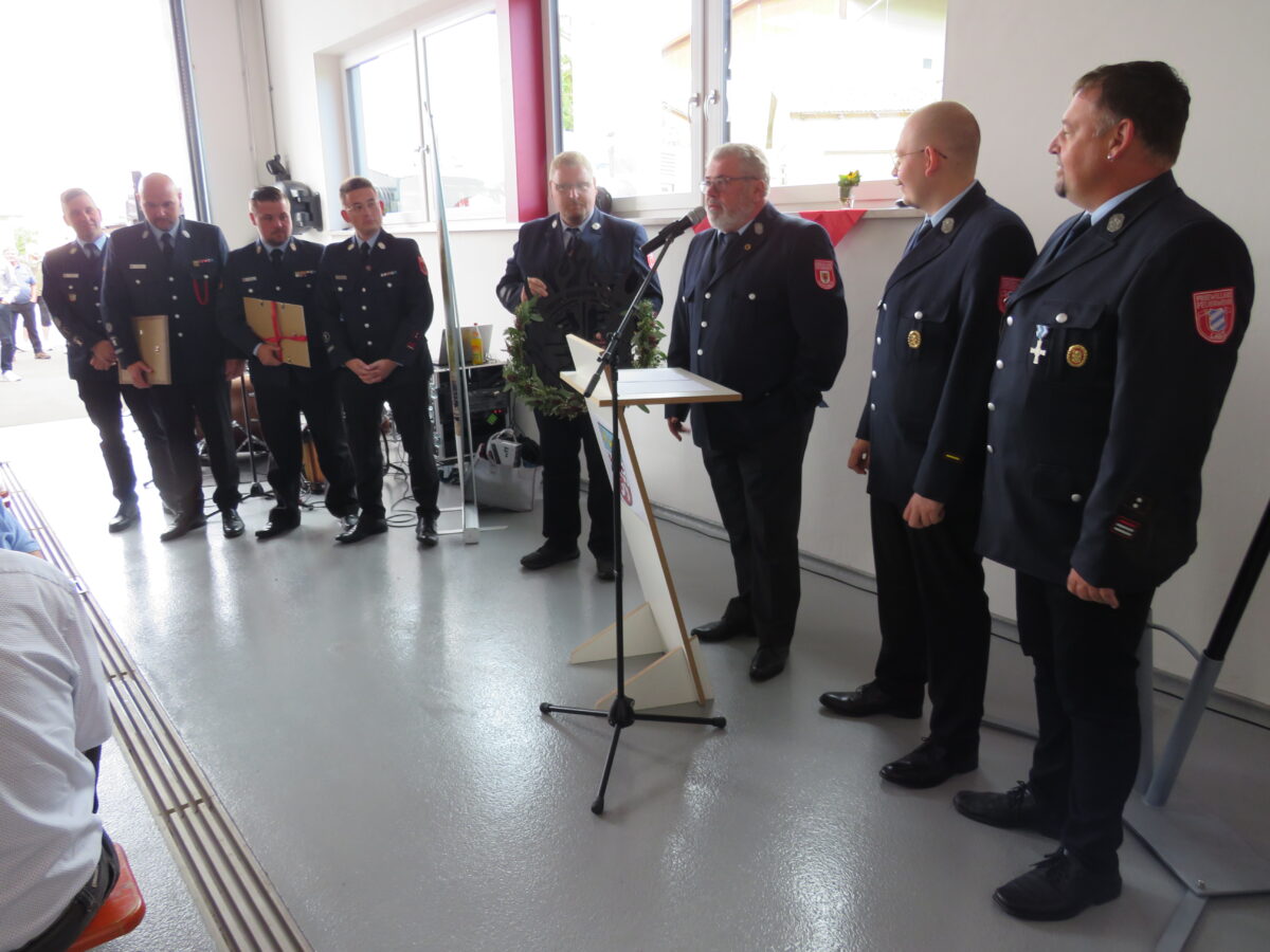 Landrat Andreas Meier bezeichnete die Doppeleinweihung als „Jahrhundertereignis“. Es ist eine seltenes Erlebnis in einem “Feuerwehrleben”. Mit dem Neubau und dem Fahrzeug wird der Verantwortung gegenüber der Einsatzkräften für eine gute Ausrüstung Rechnung getragen. Kreisbrandrat Marco Saller dankte im Namen der Landkreisführung für den Einsatz. Durch die Neuanschaffungen ist die Ausrüstung auf dem aktuellen Stand der Technik.