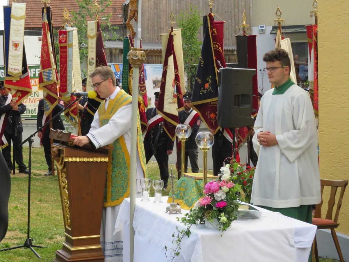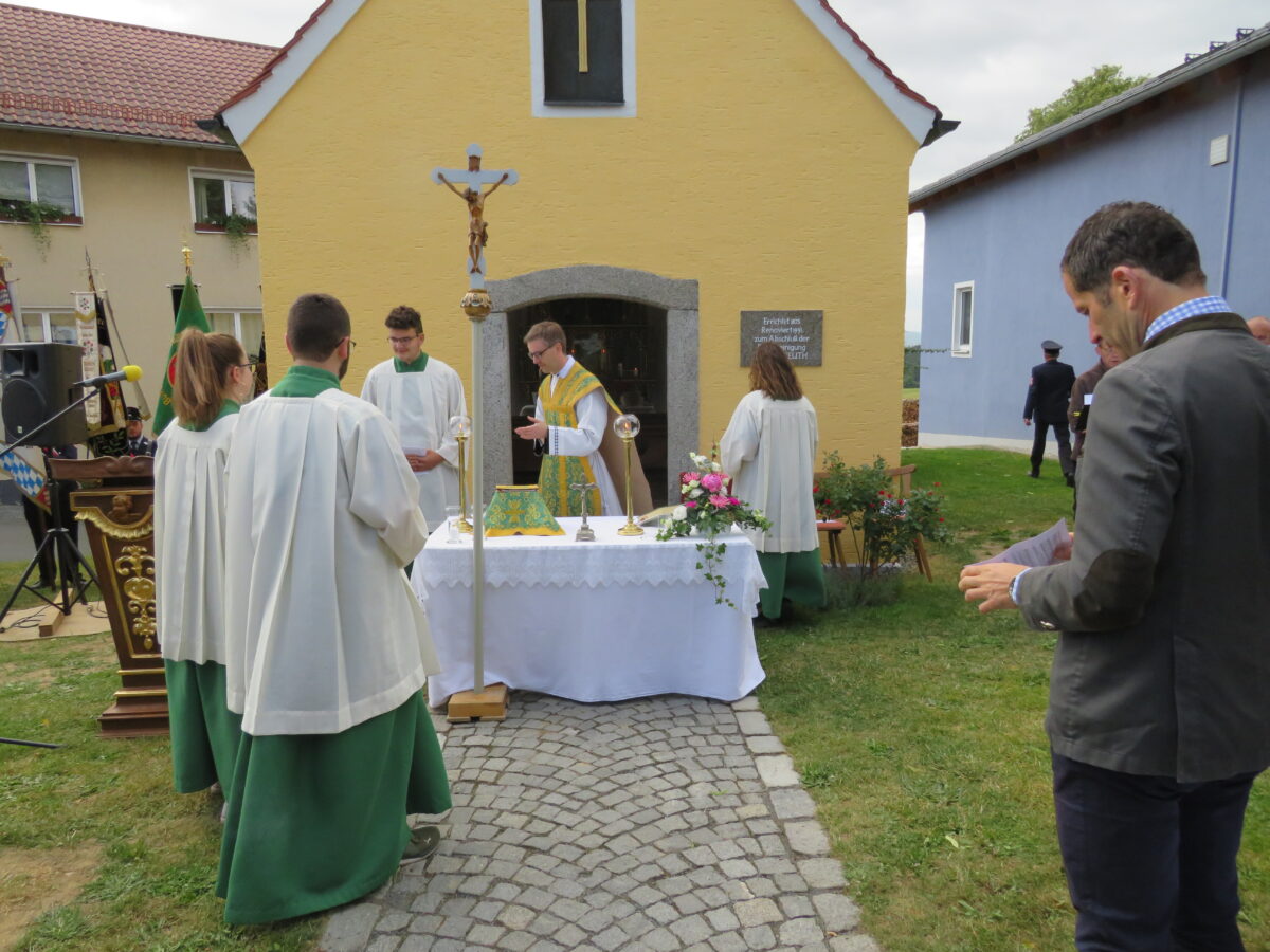 Vor der Kapelle feierte Pfarrer Thomas Kopp den Festgottesdienst. In der Predigt spannte er den Bogen von der an erster Stelle stehenden Liebe Gottes zu der Liebe zum Nächsten, die von der Feuerwehr gelebt wird.