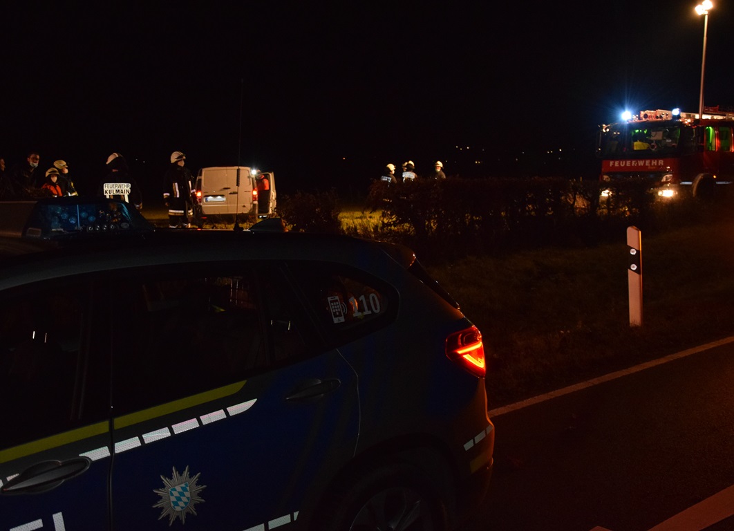 Rund 15 Kräfte der Freiwilligen Feuerwehr Kulmain, Kreisbrandmeister Florian Braunreuther und ein Rettungswagen waren unter der Leitung des Kulmainer Feuerwehrkommandant Ernst Braunreuther am Unfallort im Einsatz. Die Floriansjünger haben die Unfallstelle ausgeleuchtet, die Brandabsicherung übernommen und unterstützt das Fahrzeug zu bergen. Unverrichteter Dinge hat die Rettungswagenbesatzung den Einsatz beenden können.