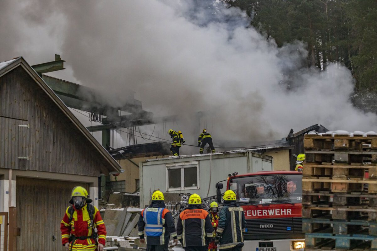 Seit den Morgenstunden kämpfen 140 Feuerwehrleute mit schwerem Atemschutz gegen das Feuer an. Der Dachstuhl einer Lagerhalle steht in Flammen, betroffen ist auch der gesamte Gebäudekomplex. Das Löschwasser wird aus dem nahegelegenen Weiher gepumpt. Eine mit einer Wärmebildkamera ausgerüstete Drohne soll weitere Brandherde aufklären.
