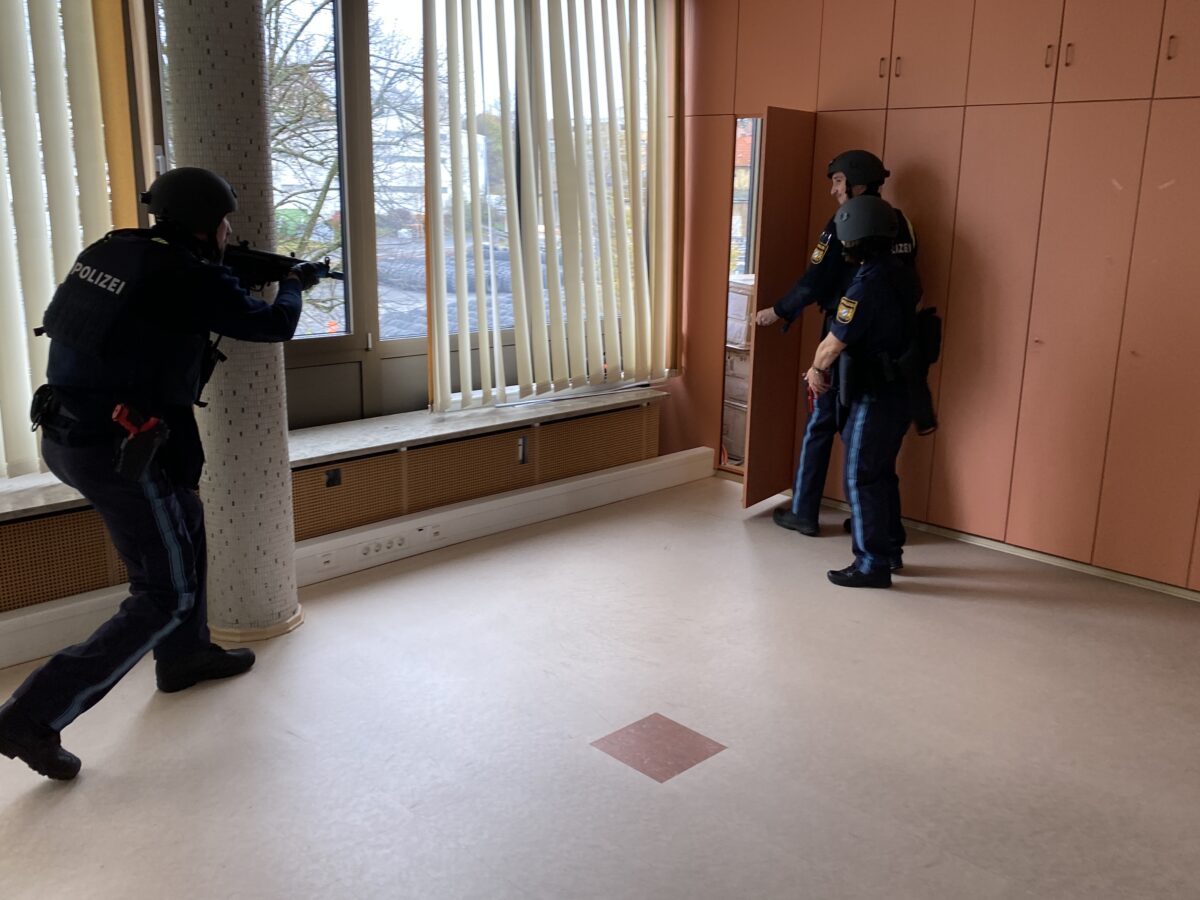 Darunter fallen beispielsweise Bedrohungen unter Mitführung von Waffen wie Messern oder Schusswaffen. Im konkreten Fall übte man den Einsatz in einer Behörde wie dem Landratsamt. Es wurde in der Übungslage von einem Angreifer ausgegangen, der mit einem Messer bewaffnet, die Mitarbeiter des Jugendamtes attackierte. In solchen Fällen ist schnelles und entschlossenes, ebenso wie koordiniertes Vorgehen erforderlich.