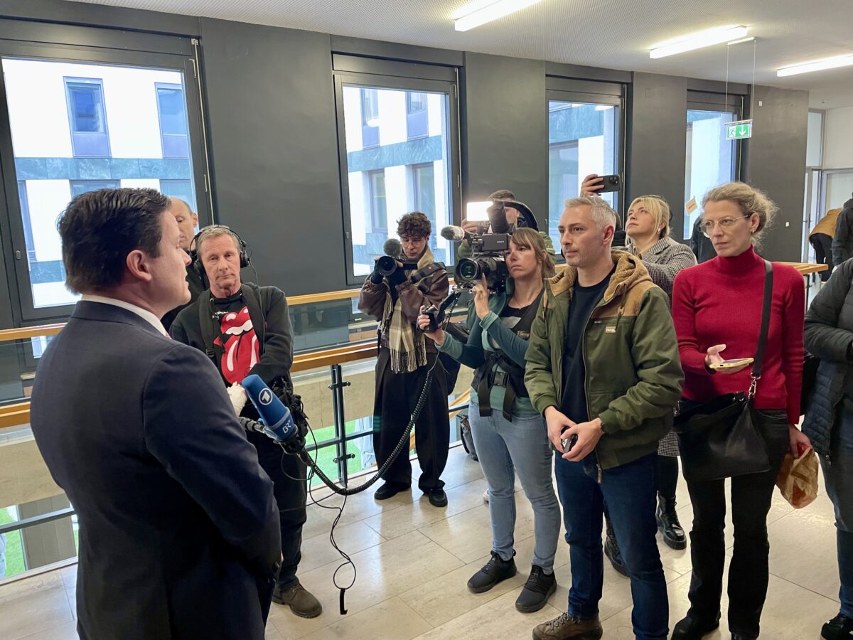 [12.30 Uhr] Die ersten Zuschauer warten vor dem Sitzungssaal 126, außerdem Vertreter von Medien. Matthias Bauer gibt als Sprecher der Justiz erste Interviews.