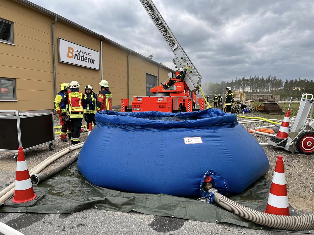 Die Floriansjünger aus Pressath konzentrierten sich auf das Stellen von Atemschutzgeräteträgern für den Innenangriff, Aufbauen eines Faltbehälters als Wasserreservoir für Innenangriff und Drehleiter, sowie die Schlauchleitung von der Wasserentnahmestelle hin zum Faltbehälter. Insgesamt waren über 120 Einsatzkräfte der Feuerwehren bei der Übung dabei. Dazu die UG-OEL des Landkreises sowie Kreisbrandrat Marco Saller, Kreisbrandinspektor Wolfgang Schwarz und die Kreisbrandmeister Jürgen Haider und Alexander Kleber. Zur Eigenabsicherung waren noch der Helfer vor Ort (HvO) Pressath und ein Krankenwagen vor Ort.
