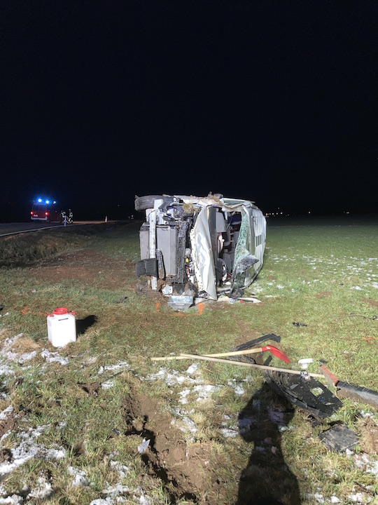 Kurz nach dem Umspannwerk kam er dann nach rechts von der Fahrbahn ab und das Fahrzeug überschlug sich mehrfach im angrenzenden Feld. Wie durch ein Wunder wurde niemand verletzt. Am völlig zerstörten Transporter entstand wirtschaftlicher Totalschaden 15.000 Euro.