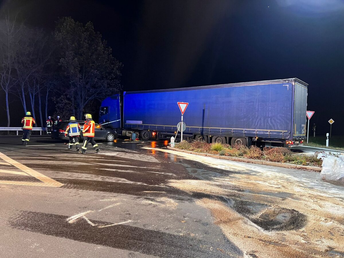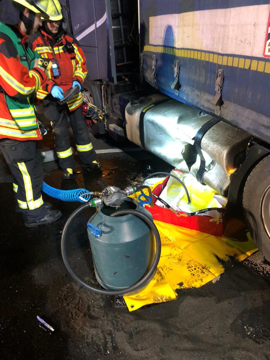 Beim Eintreffen an der Einsatzstelle bot sich den Einsatzkräften ein größeres Schadensausmaß. „Zu diesem Zeitpunkt hatten sich bereits mehrere hundert Liter Dieselkraftstoff aus dem Kraftstofftank des Lastwagens auf die Fahrbahn ergossen und großflächig verteilt. Es bestand erhöhte Rutsch- und Unfallgefahr“, informiert Feuerwehrsprecher Michael Denz.