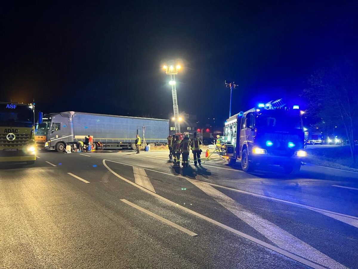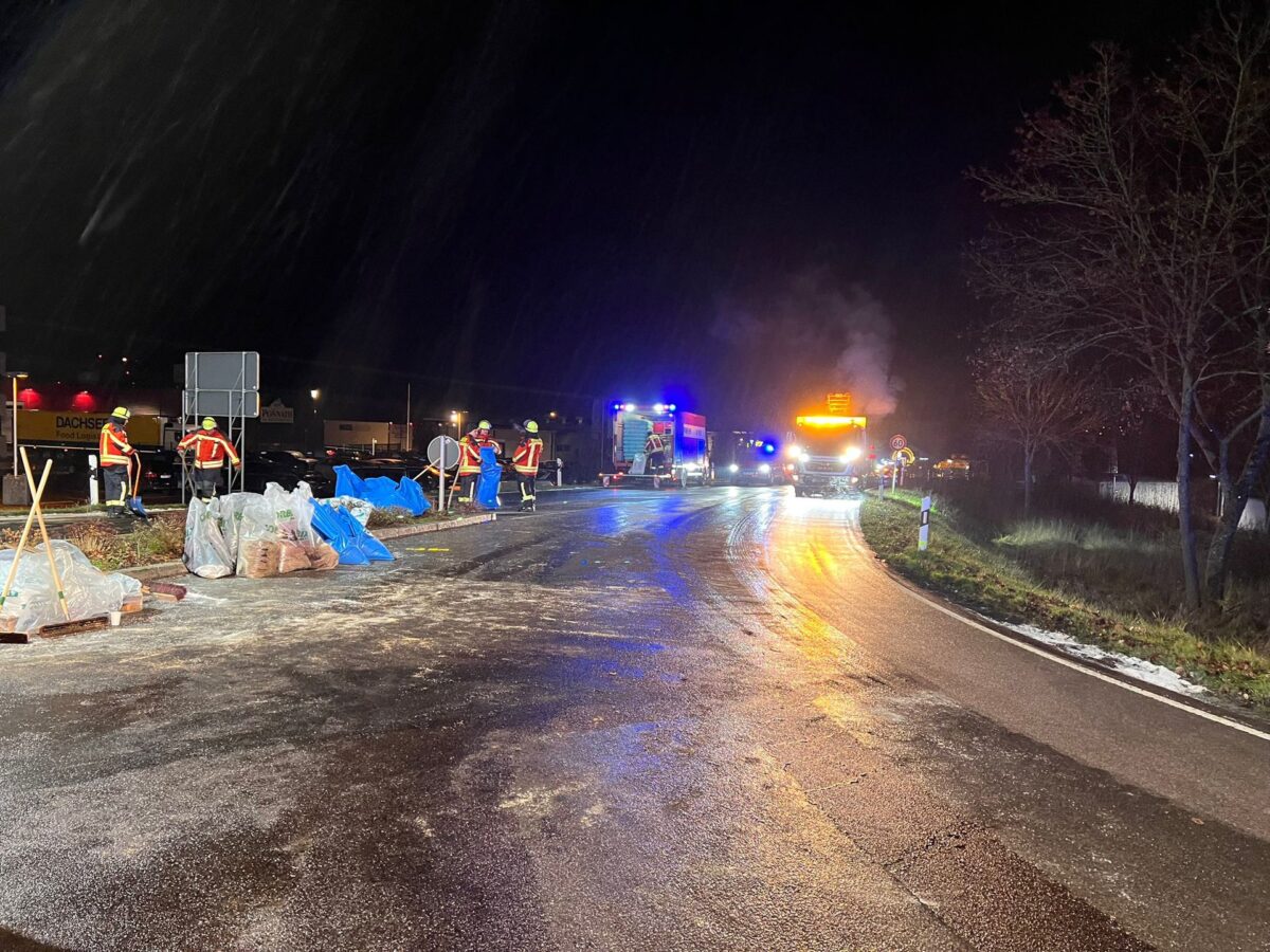 „Umgehend wurde die Einsatzstelle verkehrstechnisch abgesichert, Maßnahmen zum Eindämmen und Auffangen des auslaufenden und bereits ausgelaufen Dieselkraftstoffes eingeleitet, der zweifache Brandschutz sichergestellt und weitere Einsatzkräfte und -mittel nachalarmiert“, teilt die Feuerwehr Kemnath mit.