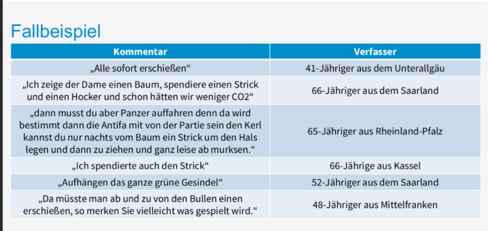 “Das K5 hat inzwischen fast täglich mit Hasskriminalität zu tun”, berichtet Leiterin Nicole Götz. Die Zahlen sind stark gestiegen. Kommissar Thomas Völkl hat Beispiele aus der täglichen Arbeit dabei. “Früher wurde so jemand erschossen und gut.” “Unsere Goldstücke bei der Arbeit!!! Kugel zwischen die Augen!!!” Oder jüngst unter einem Foto des deutschen Basketballers Dennis Schröder: “Eine Kuh, die im Pferdestall geboren ist, wird auch nicht zum Pferd.”
