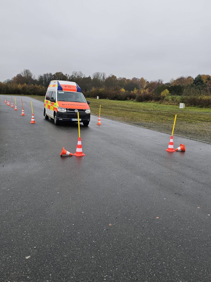 Dazu zählten unter anderem die Geschicklichkeit beim Slalomfahren, das Passieren von Engstellen, das zügige Wenden bis hin zur Gefahrenbremsung mit Ausweichen, simuliert bei Nässe – siehe Bild –. Die Herausforderung dazu stellte das BRK-Team sich selbst, indem es mit unterschiedlichen Einsatzfahrzeugen am Kurs teilnahm.