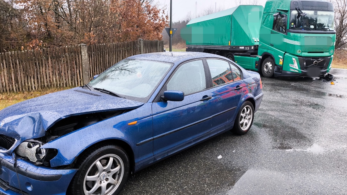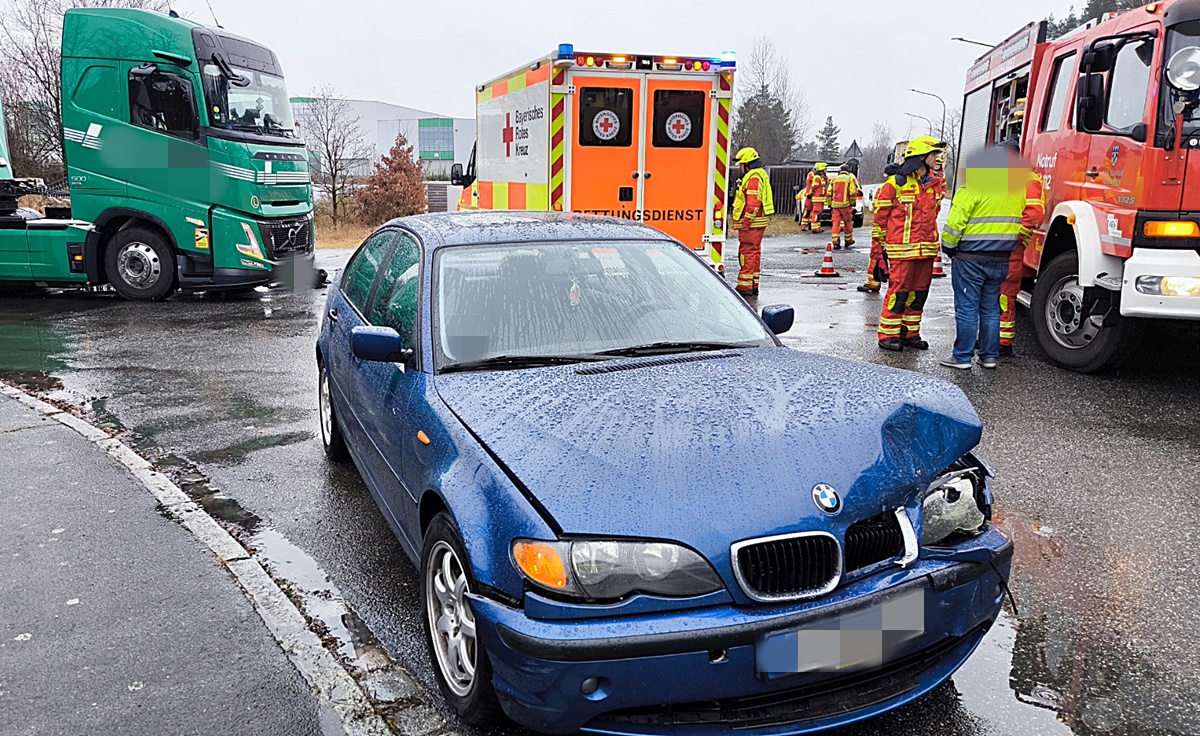 Gegen 10:20 Uhr kam es im Industriegebiet von Weiherhammer zu einem Verkehrsunfall zwischen einem PKW und einem Sattelzug. Ein BMW-Fahrer wollte bei regennasser Fahrbahn von der Flachglasstraße in die Etzenrichter Straße einbiegen.