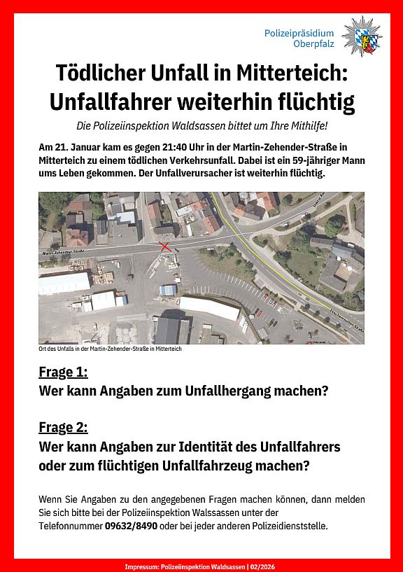 In den kommenden Tagen werden die Plakate in Mitterteich aufgehängt und Flyer an die Anwohner verteilt. Dabei wird auch nochmals eine Anwohnerbefragung durchgeführt. Die Ermittlungsgruppe der Polizeiinspektion Waldsassen arbeitet zusammen mit der Verkehrspolizeiinspektion Weiden und der Kriminalpolizeiinspektion Weiden weiterhin mit Hochdruck an der Rekonstruktion des Unfallhergangs und der Ermittlung des Unfallfahrers.