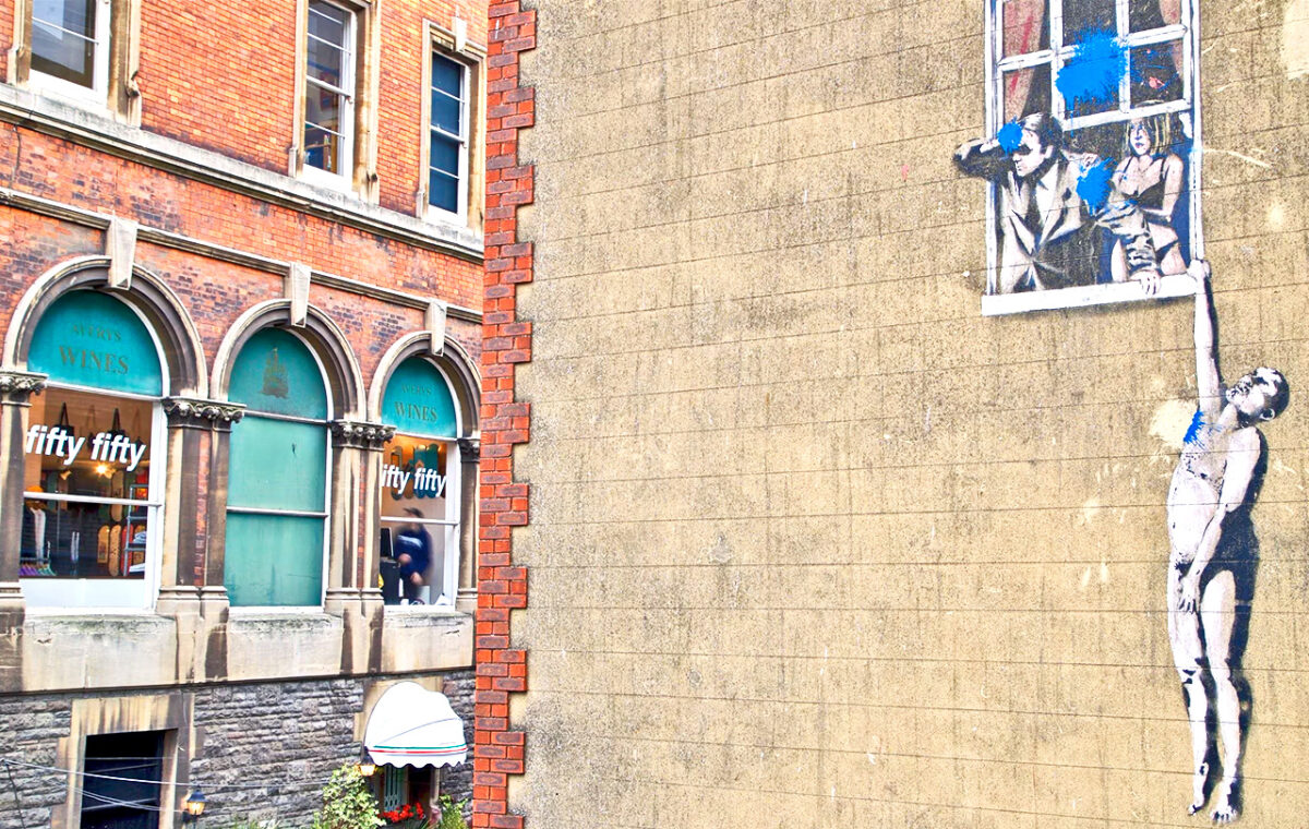 Etwa eines seiner inzwischen bekanntesten Werke „Well Hung Lover“. Es sollte einst entfernt werden, was Banksys wachsender Ruhm verhinderte. Das Werk auf der Fassade der ehemaligen Klinik für Sexualmedizin zeigt einen nackten Mann, der aus dem Fenster hängt, um den Augen des eifersüchtigen Ehemannes zu entgehen, der nach ihm Ausschau hält.