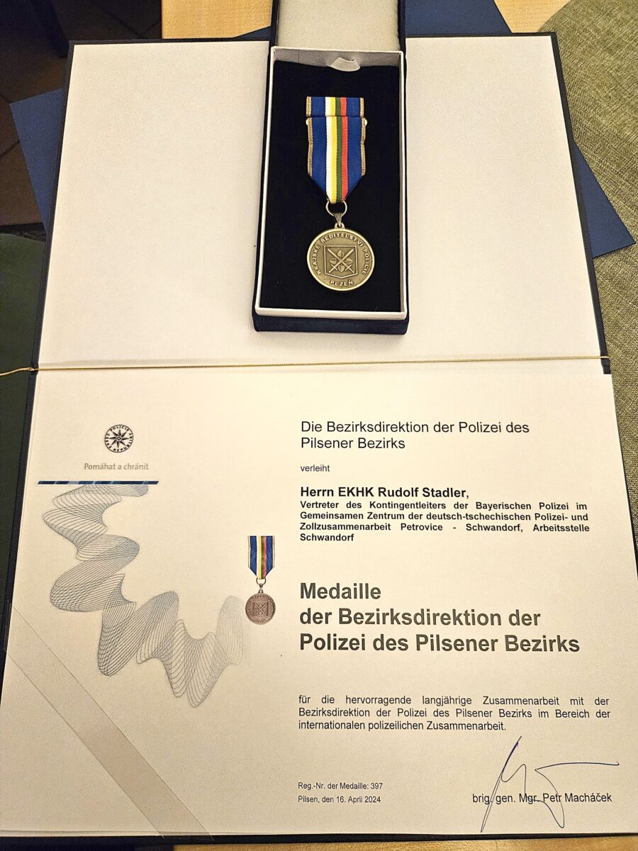 Erster Kriminalhauptkommissar Rudolf Stadler ist in seiner Funktion als stellvertretender Kontingentleiter der Bayerischen Polizei bereits seit rund 13 Jahren nicht nur für die örtlichen Mitarbeiter der bayerischen Polizei Ansprechpartner und Vorgesetzter, sondern auch für die anderen beteiligten Behörden aufgrund seiner langen Zugehörigkeit ein kontinuierlicher Garant für einen professionellen Austausch. Diese langjährige und beispiellose Zusammenarbeit mit der tschechischen Polizei wurde nun durch die Polizei des Pilsener Bezirks mit deren Ehrenmedaille und durch die Polizei des Bezirks Südböhmen durch deren Ehrenmünze gewürdigt.
