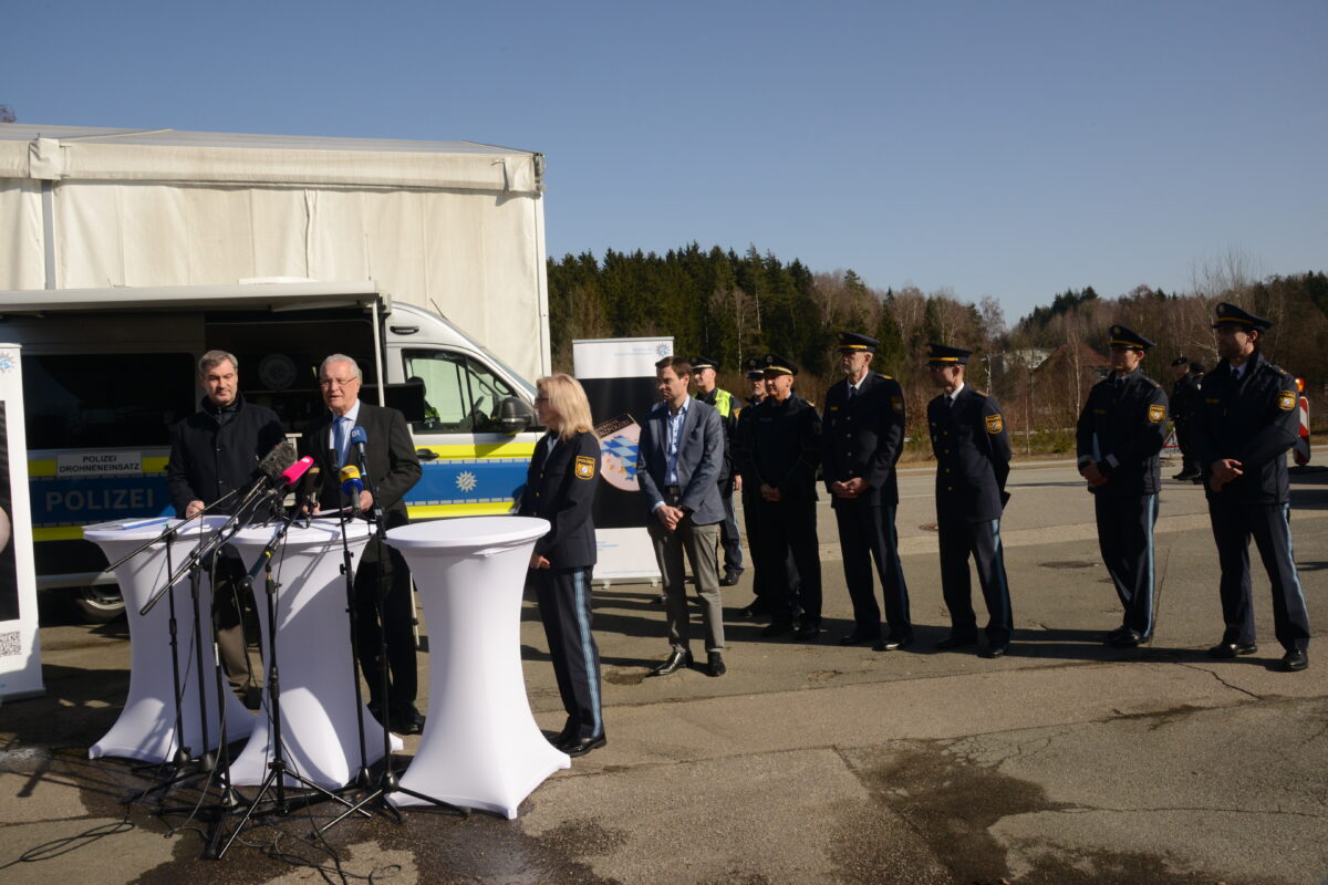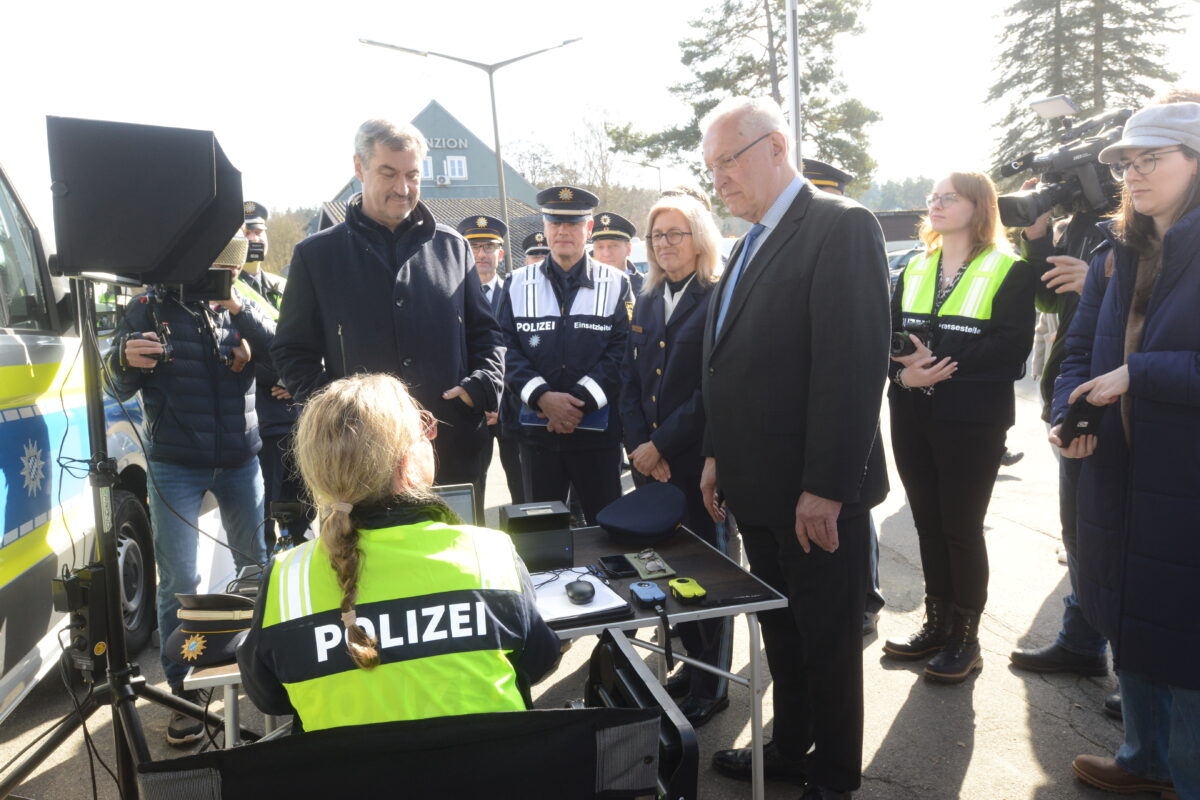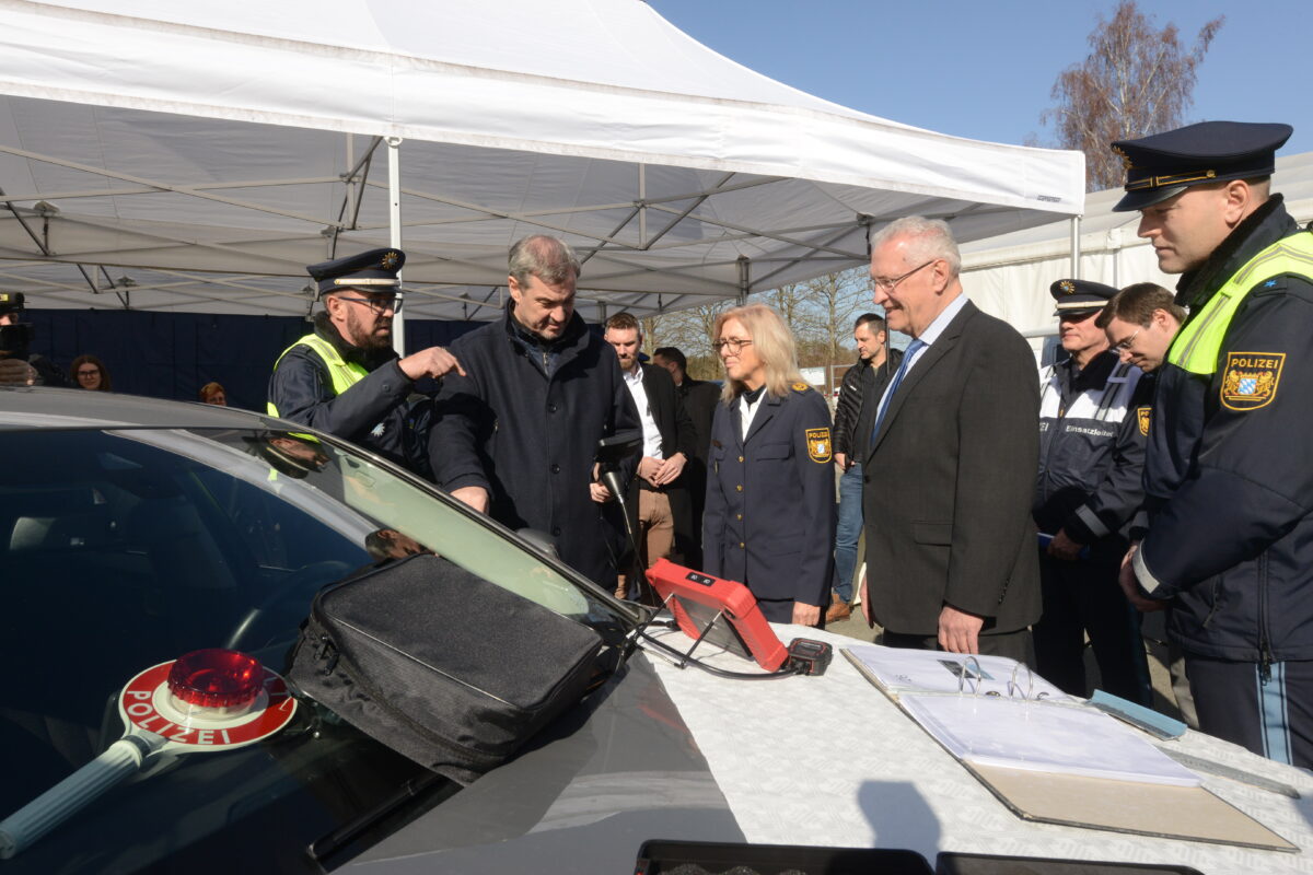 Über den Einsatz der hochmodernen Technik konnten sich anschließend Bayerns Ministerpräsident Dr. Markus Söder gemeinsam mit Innenminister Joachim Herrmann bei der Möglichkeit zur Personenkontrolle, bei der Überprüfung eines eingereisten Lastkraftwagens, beim Einsatz von Personendetektionsgeräten, einer supermodernen Drohne und weiteren Techniken informieren.